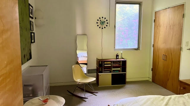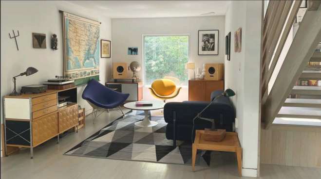 The main level is open and light-filled with polished concrete floors, double-height ceilings, and floor-to-ceiling glass. The living area features authentic mid-century pieces: Eames rocker, Nelson accents, vintage scientific prints, and a working record player.