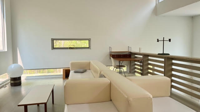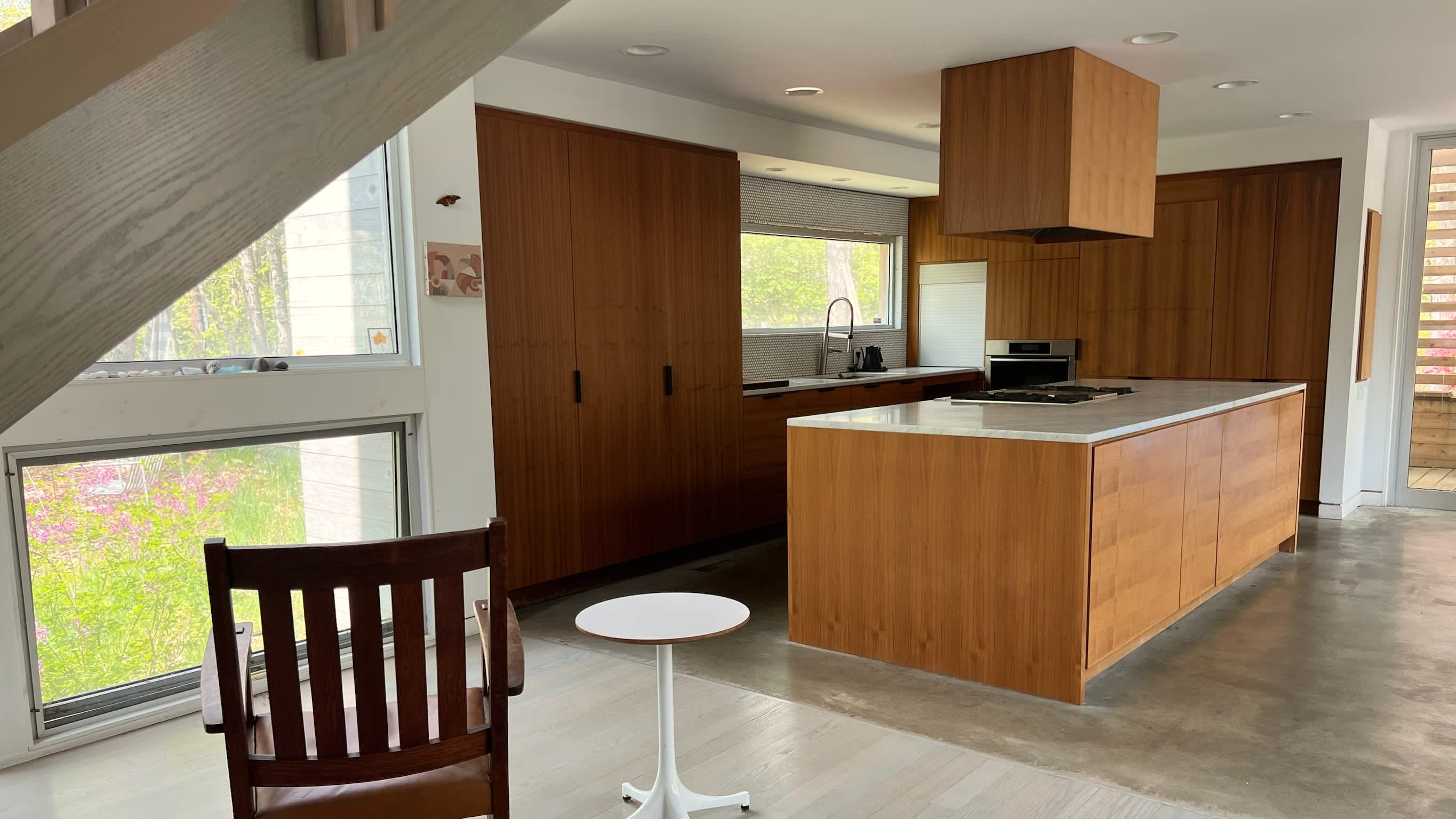 A design-forward 3-bedroom retreat in Southold with curated mid-century interiors, floor-to-ceiling glass, and a heated lap pool surrounded by woods. Complete privacy. Less than half a mile to a Long Island Sound beach. Dedicated workspace with printer for remote stays. Sleeps 6.