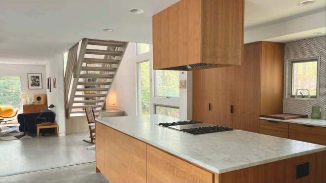The kitchen has warm wood cabinetry, a gas cooktop, full-size appliances, and a marble-topped island. The dining table seats six under a Noguchi-style pendant with views of the pool and surrounding trees.