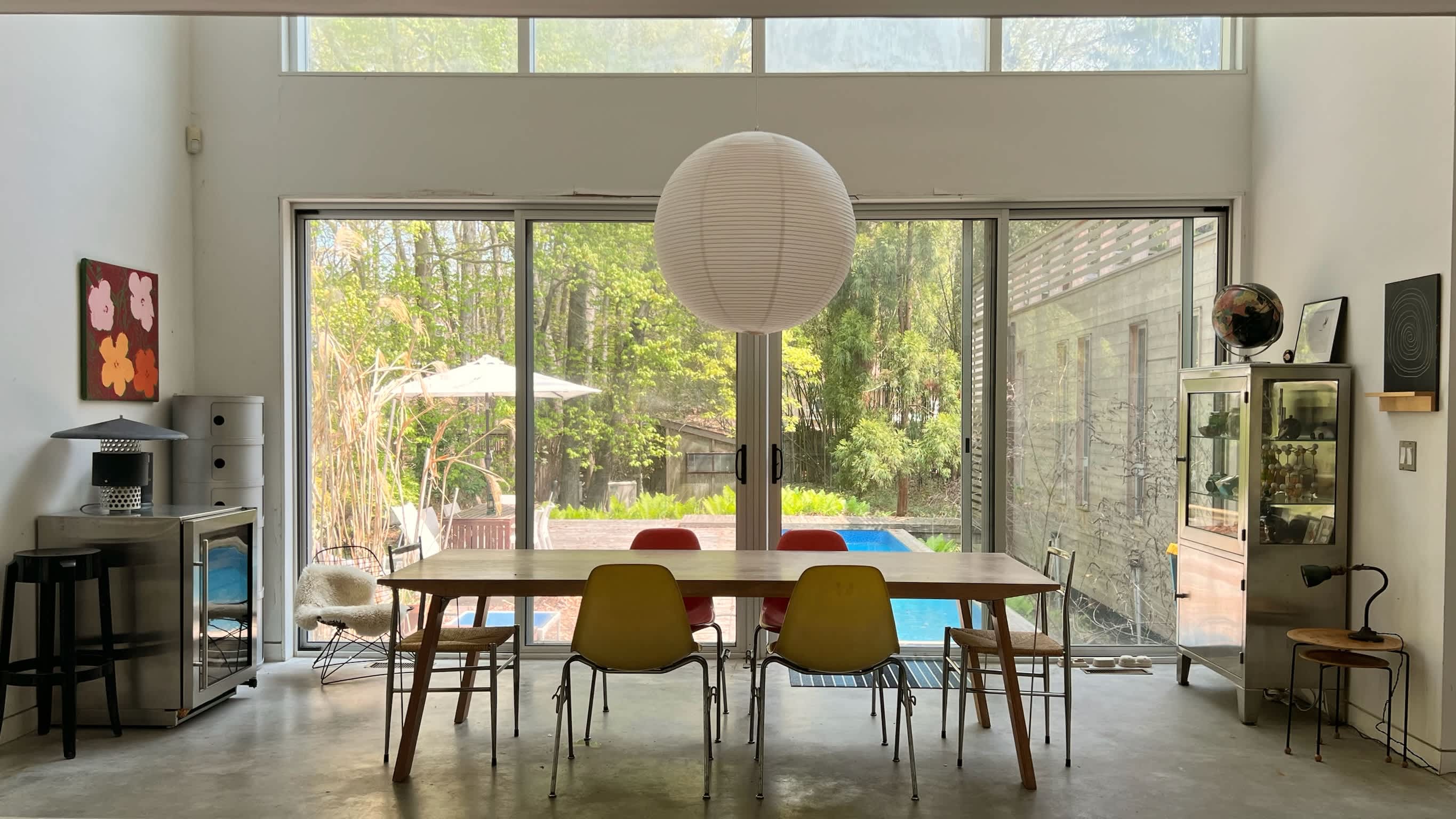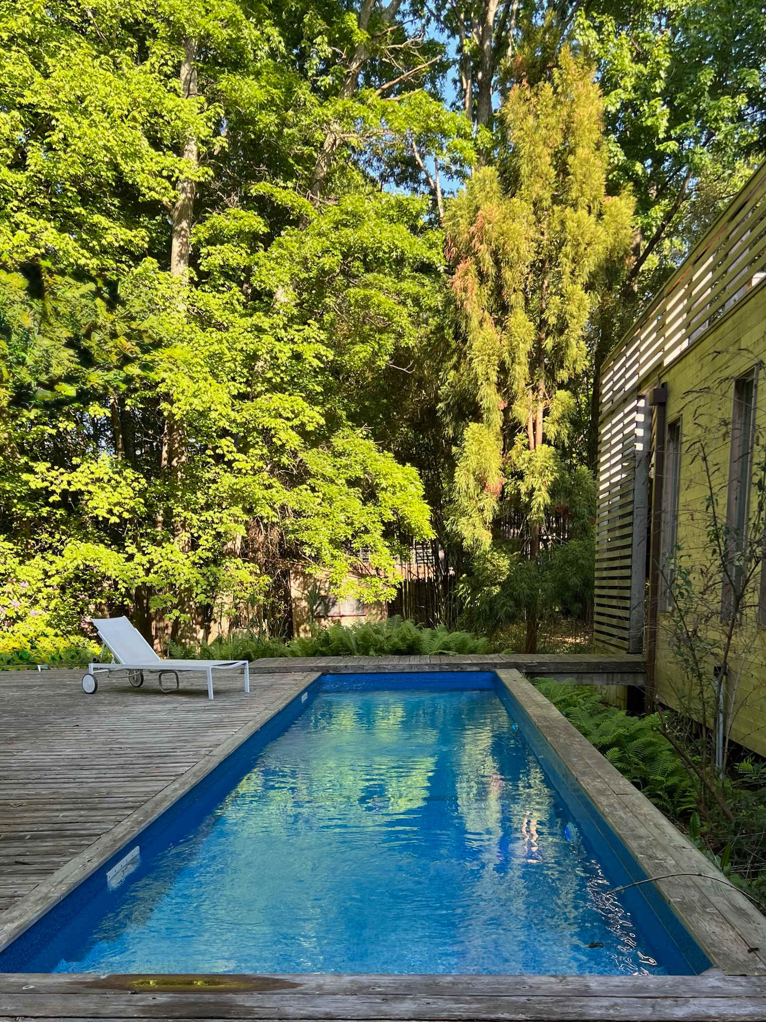 This is a creative's home, not a generic rental. Clean lines, warm materials, and walls of glass that open directly to the pool deck and woods. Calm, private, and thoughtfully curated.