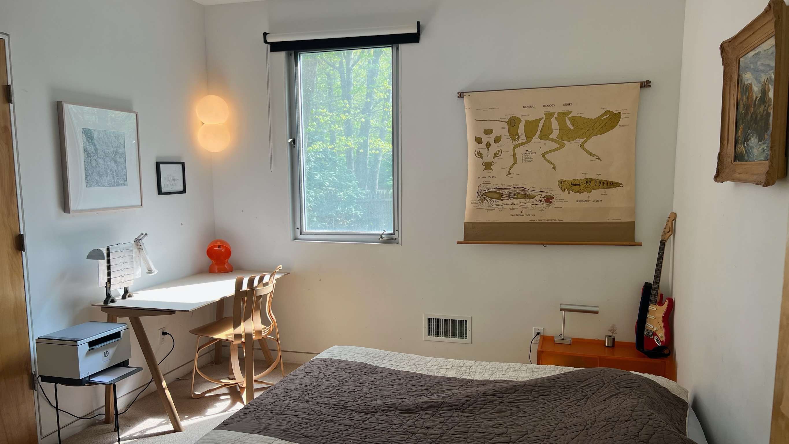 Bedroom 2: Double bed with full desk setup and printer. Best for remote work.