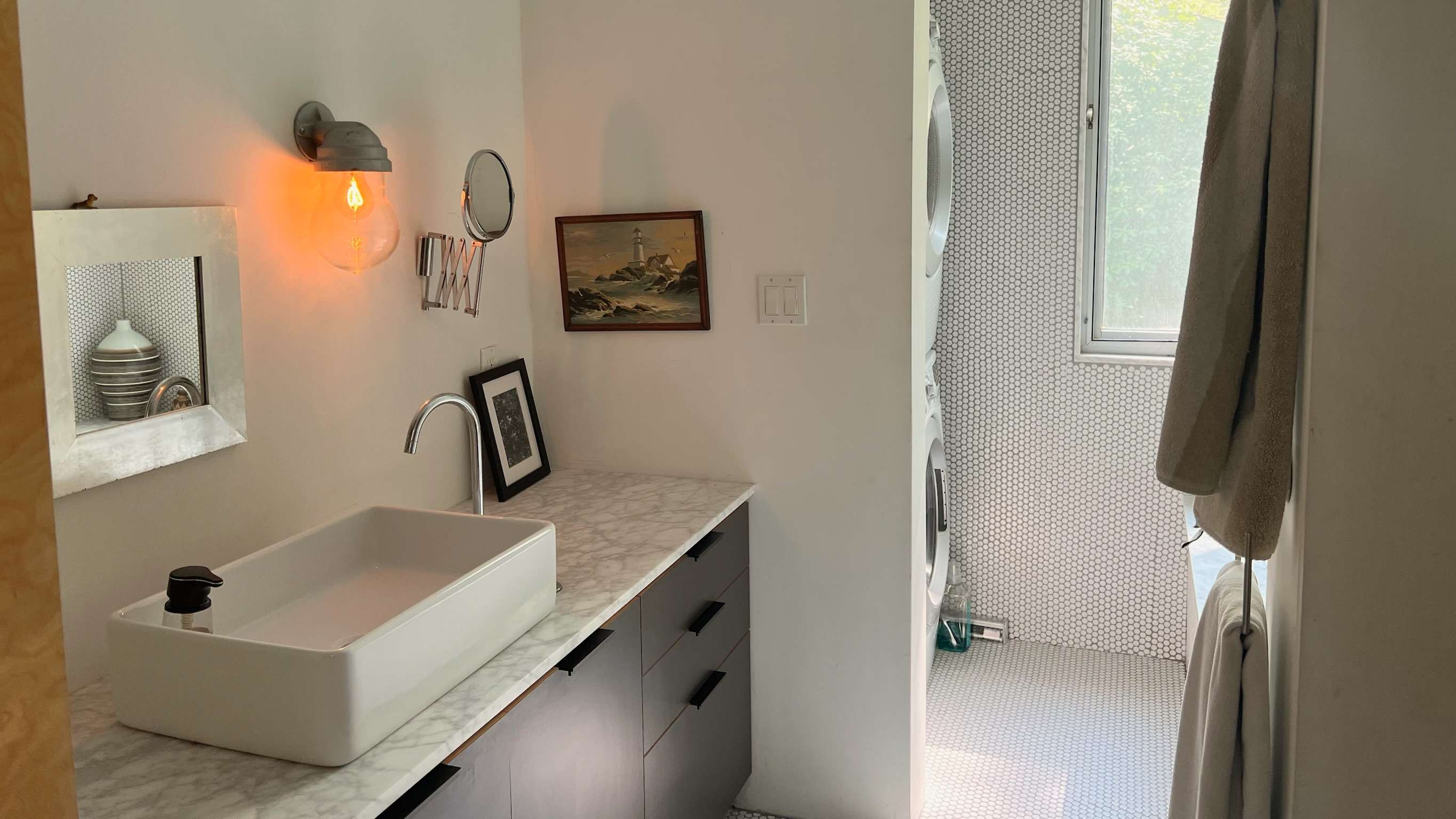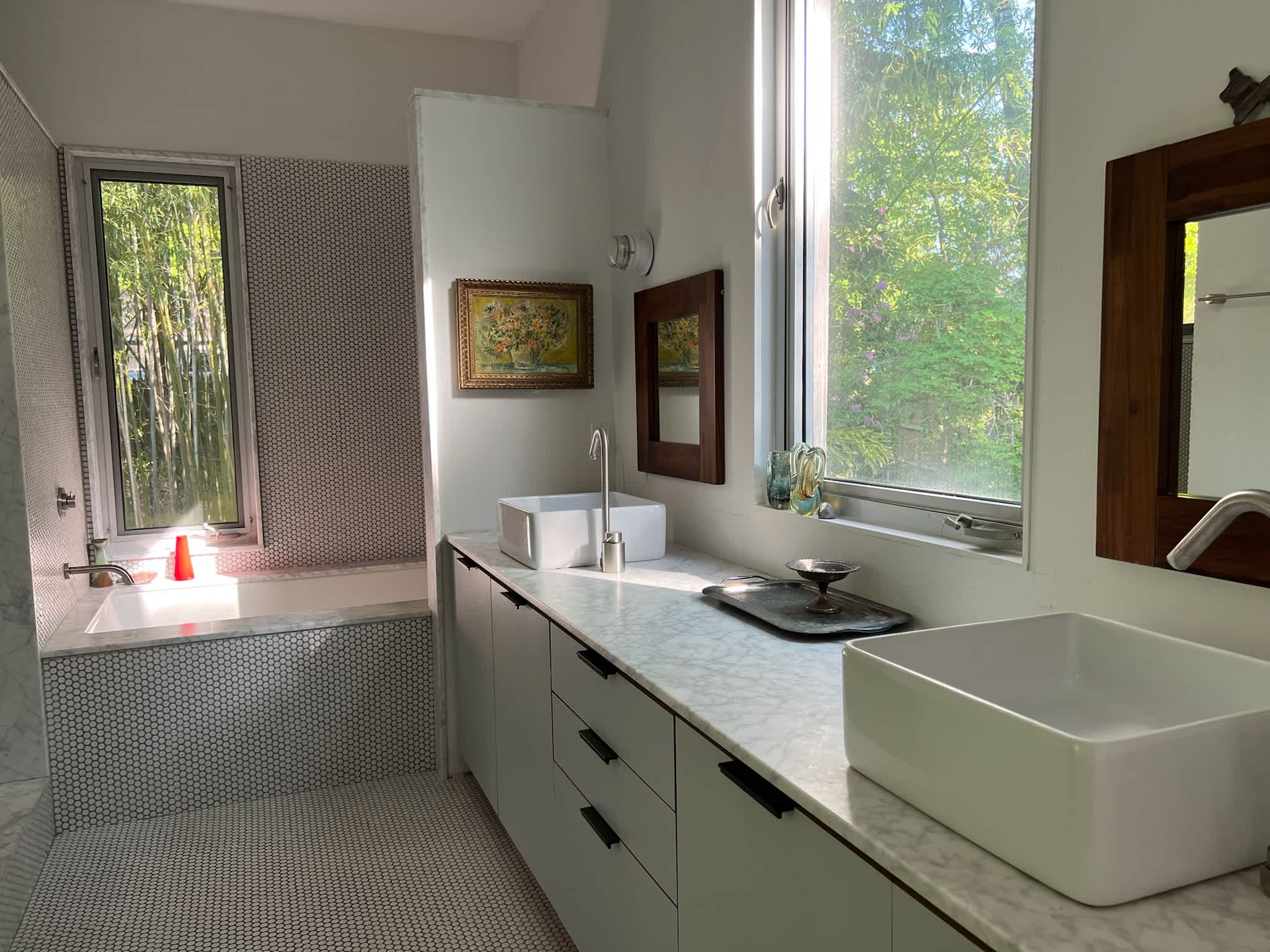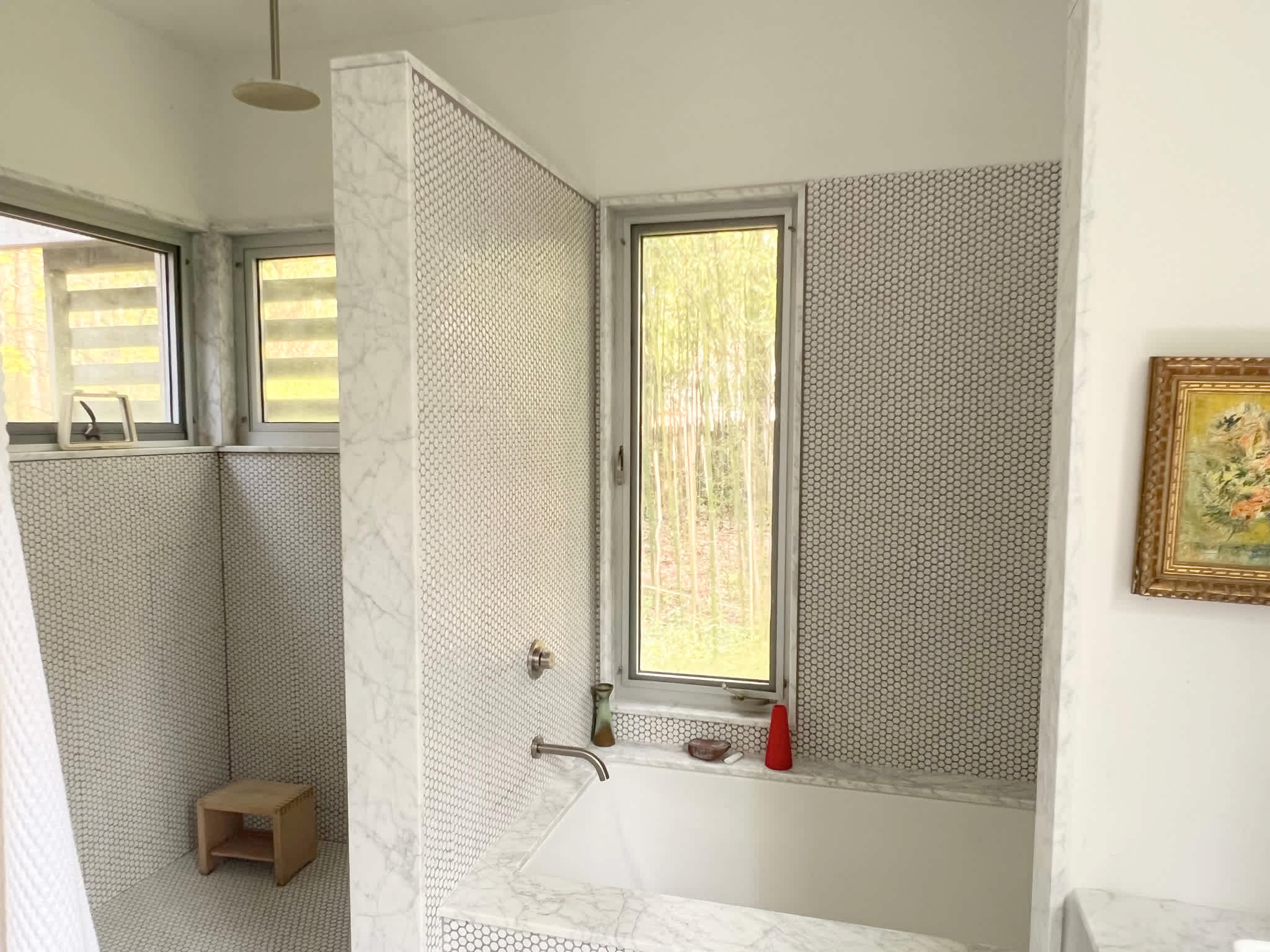Two full bathrooms with penny tile, vessel sinks, and marble counters. The primary bath includes a soaking tub with bamboo views and a separate rain shower.