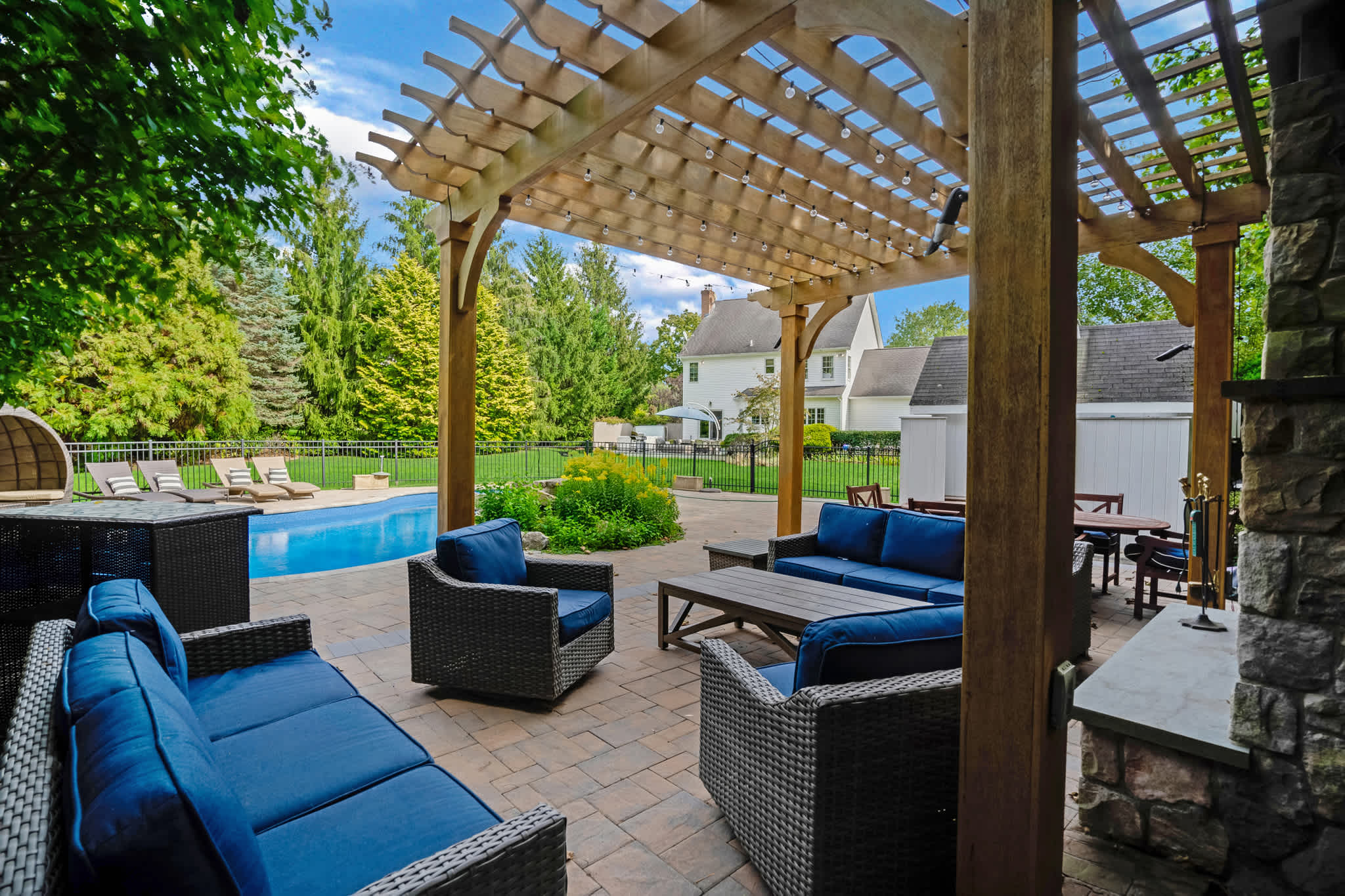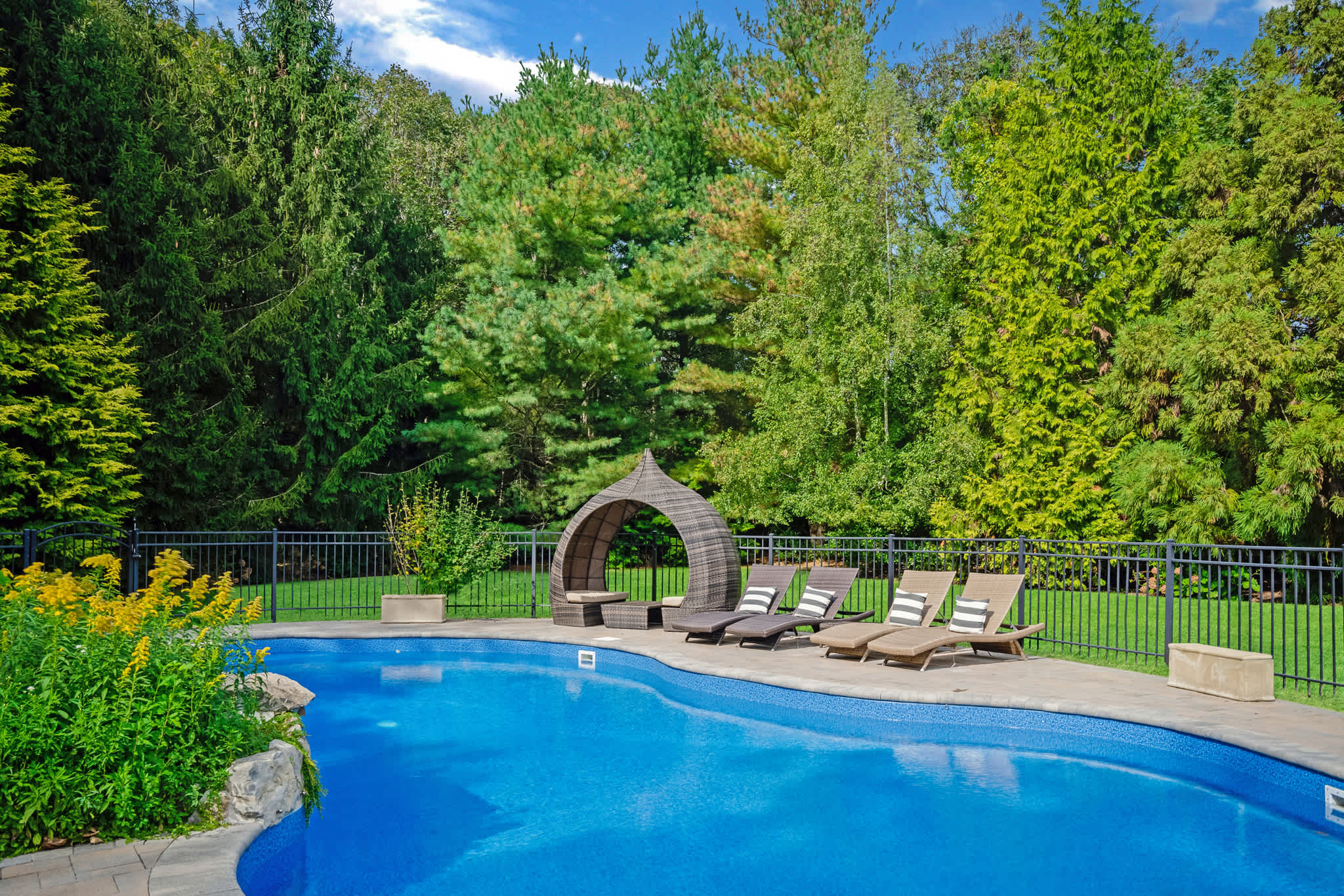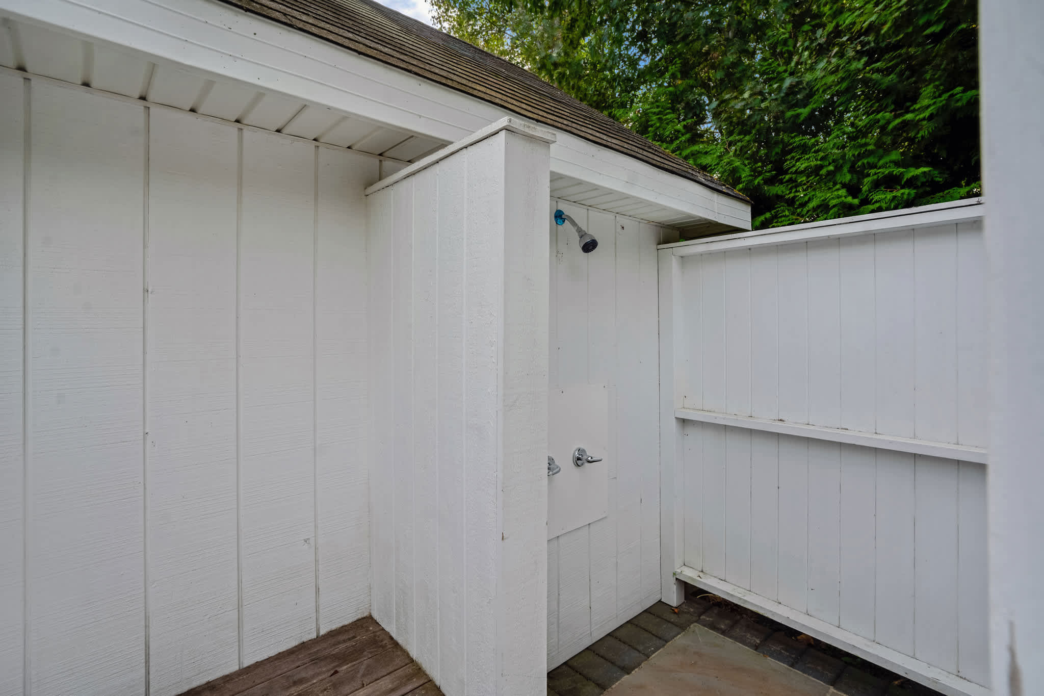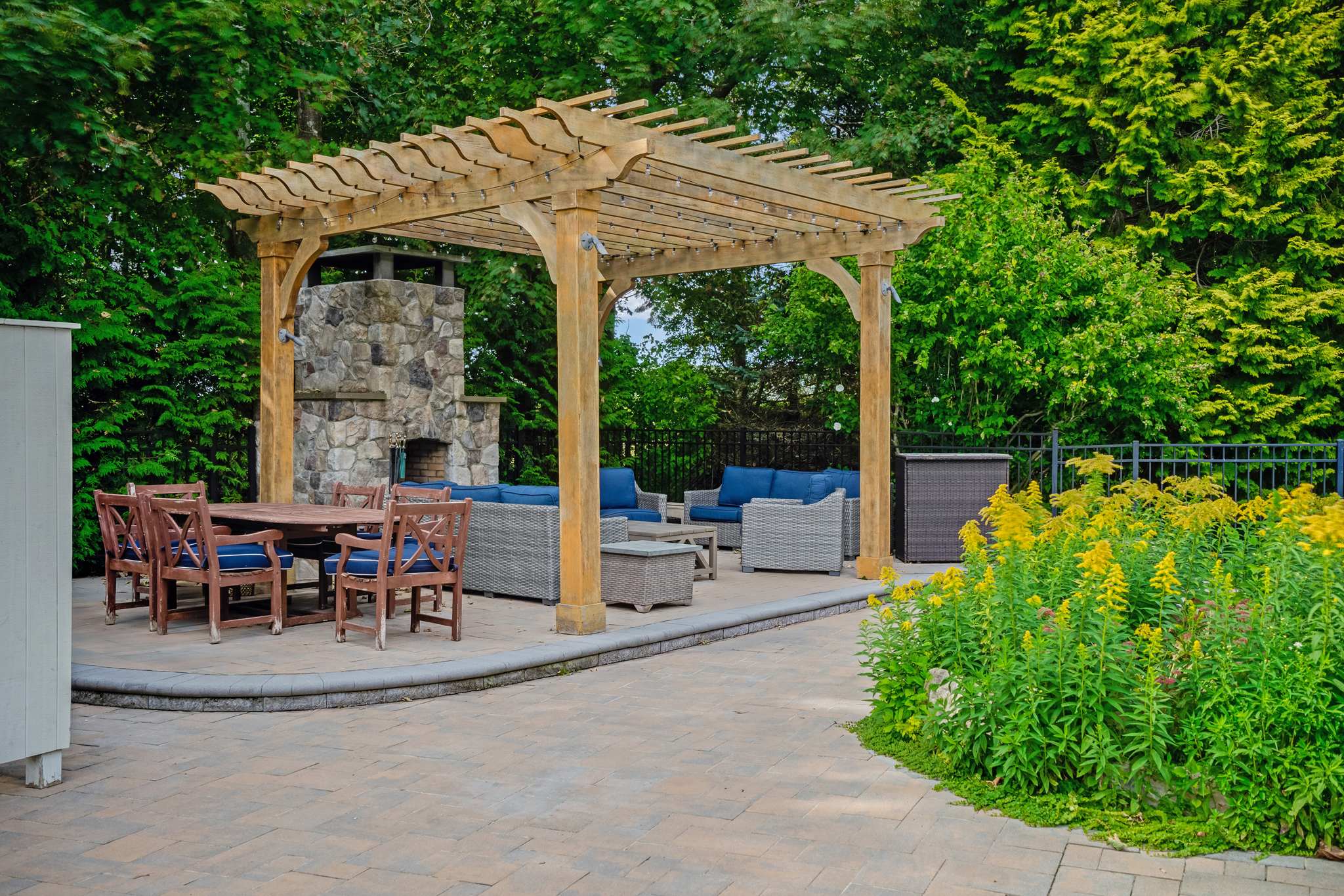 The property is home to a truly special outdoor space including a large, heated pool and jacuzzi. You can whip up your BBQ favorite on the propane grill located on the back patio. Under a custom-built wooden pergola is a stone fireplace with seating for the whole family to enjoy. A private beach is located right across the street.