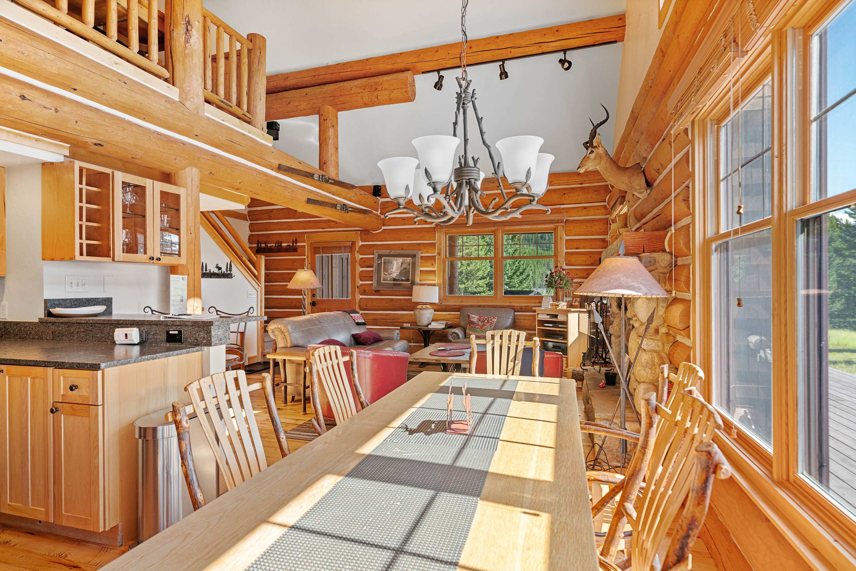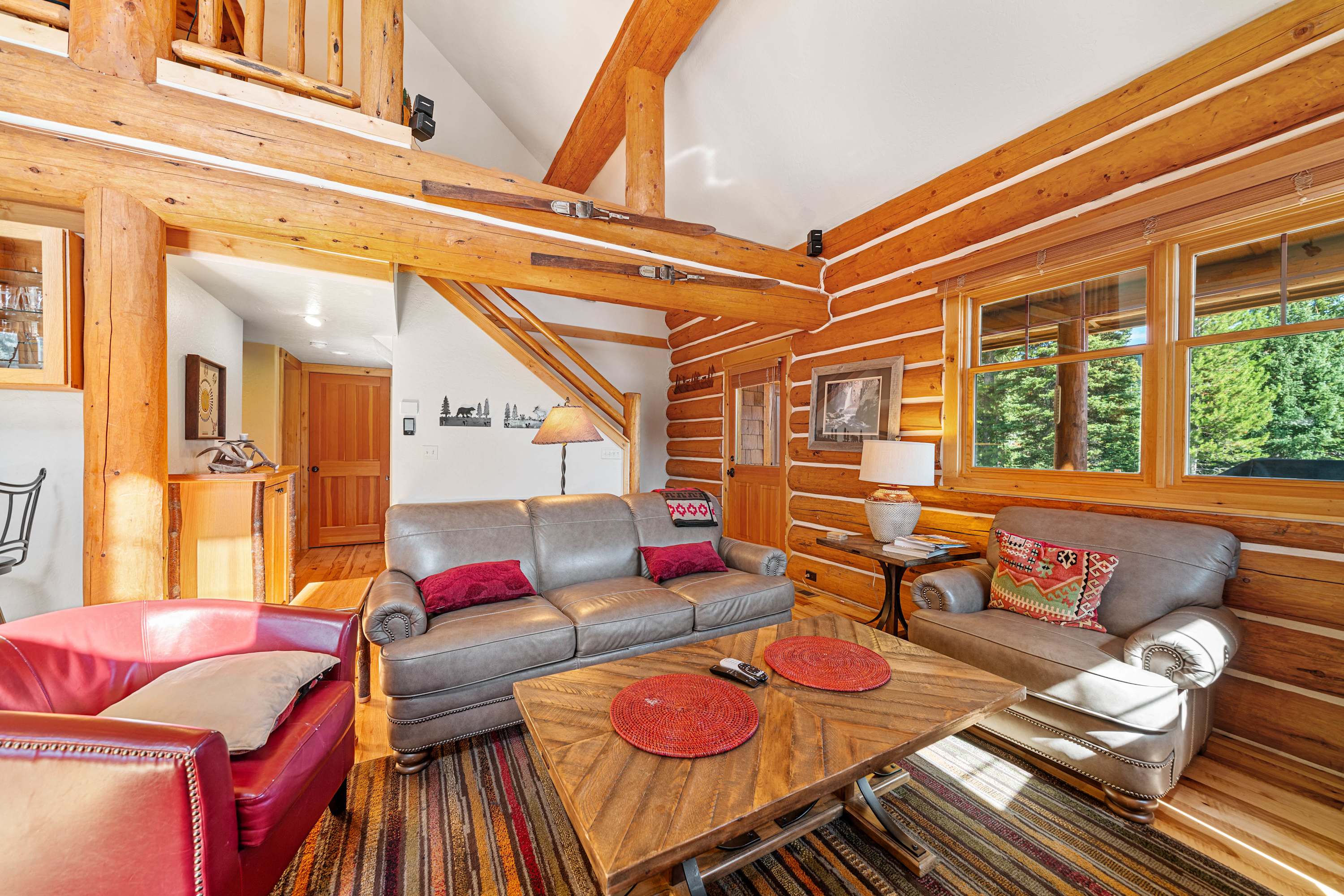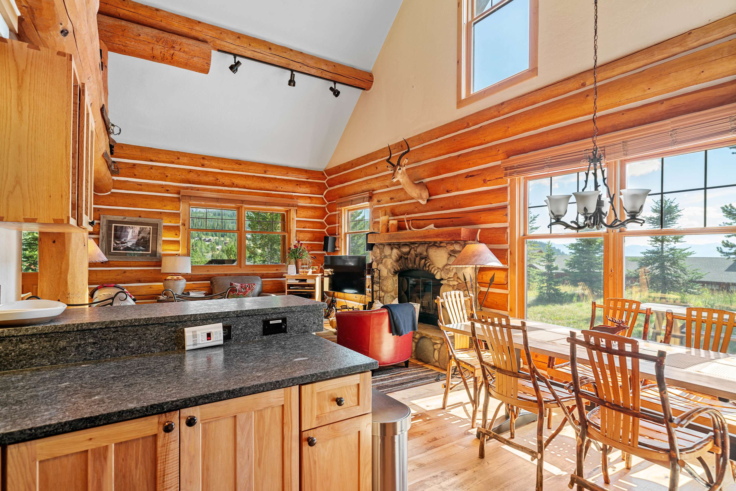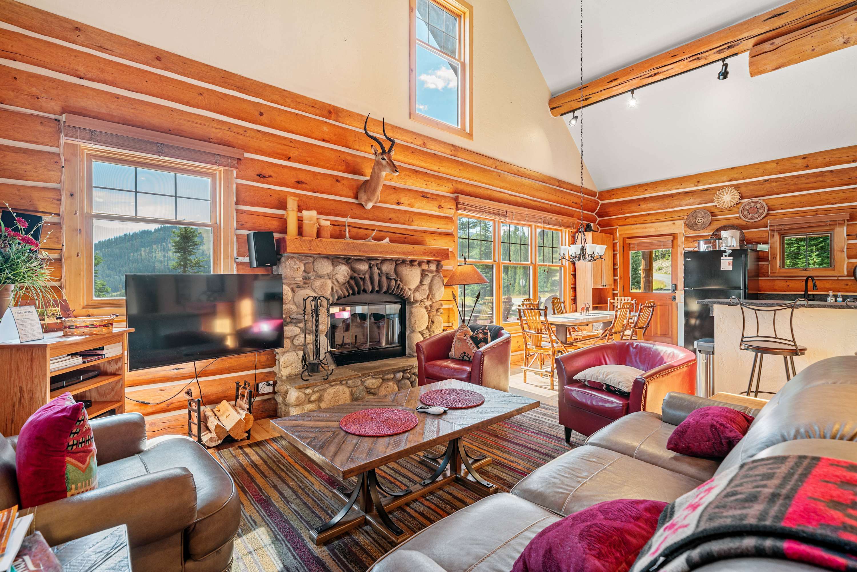 Powder Ridge Log Cabin boasts 1,600 sq feet of well-appointed living space over two levels for recreation, relaxation and good times with friends and family. The luxurious interiors elegantly complement the rustic, cabin-in-the-woods exterior. Soaring vaulted ceilings, log paneling and rustic accents give this Big Sky rental a true mountain cabin ambiance.