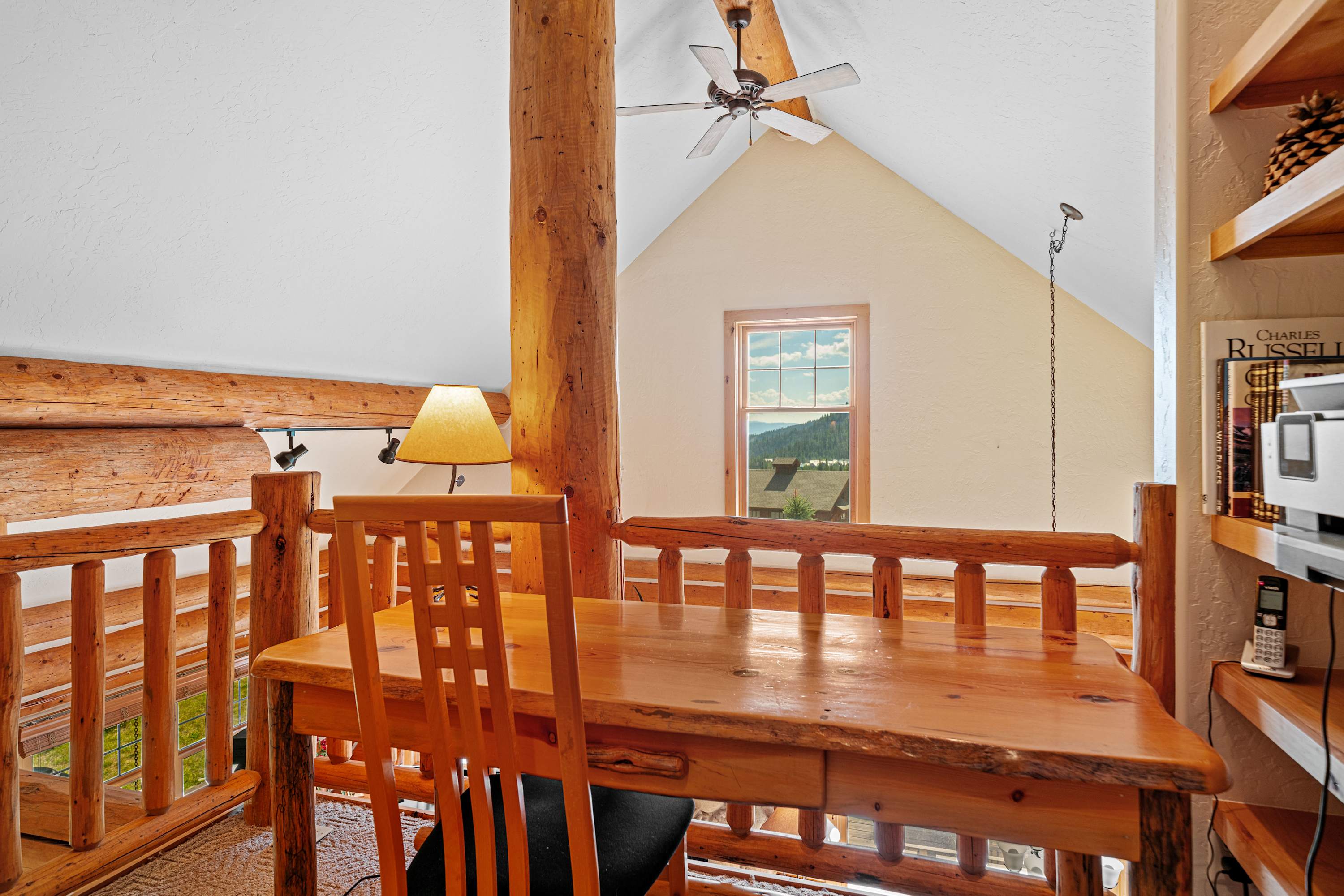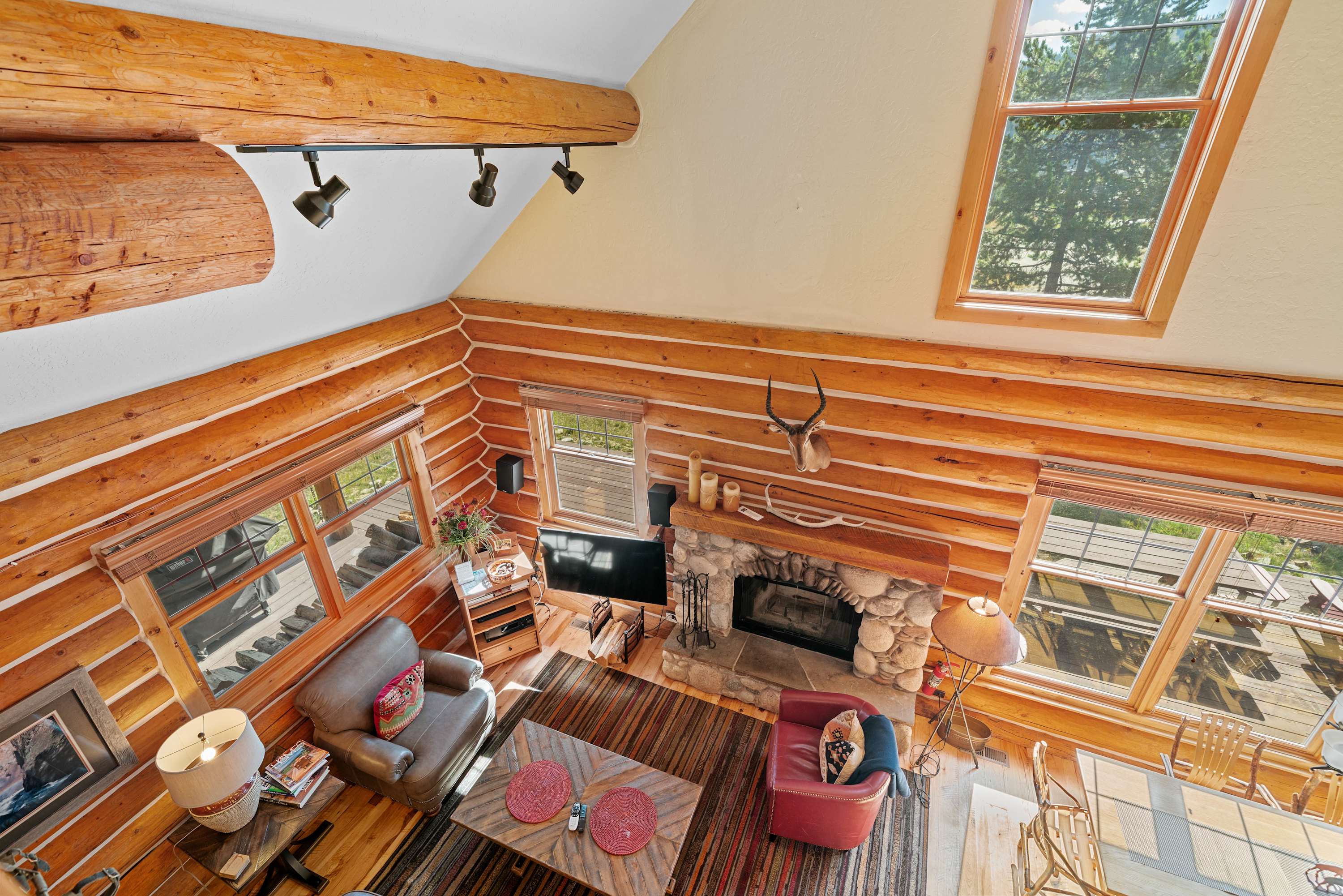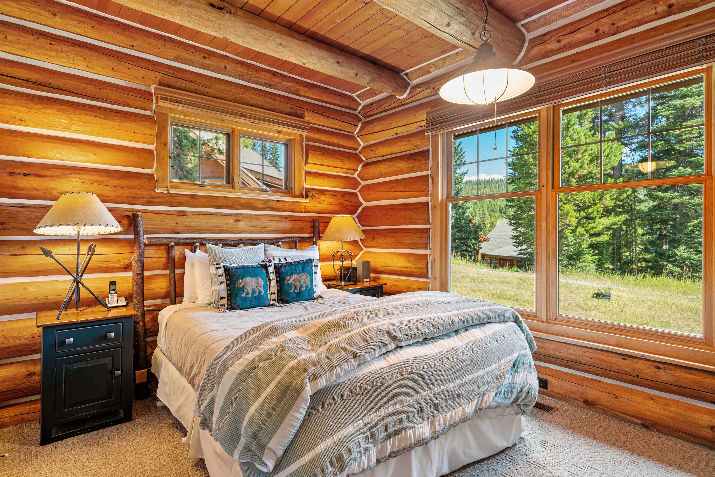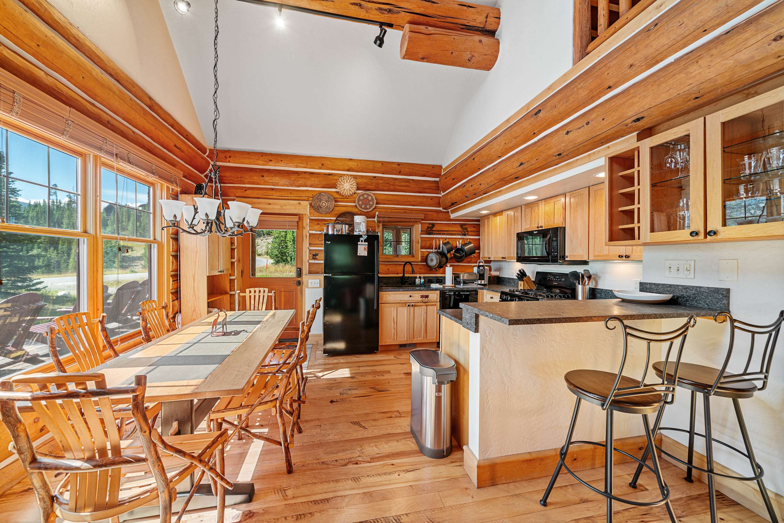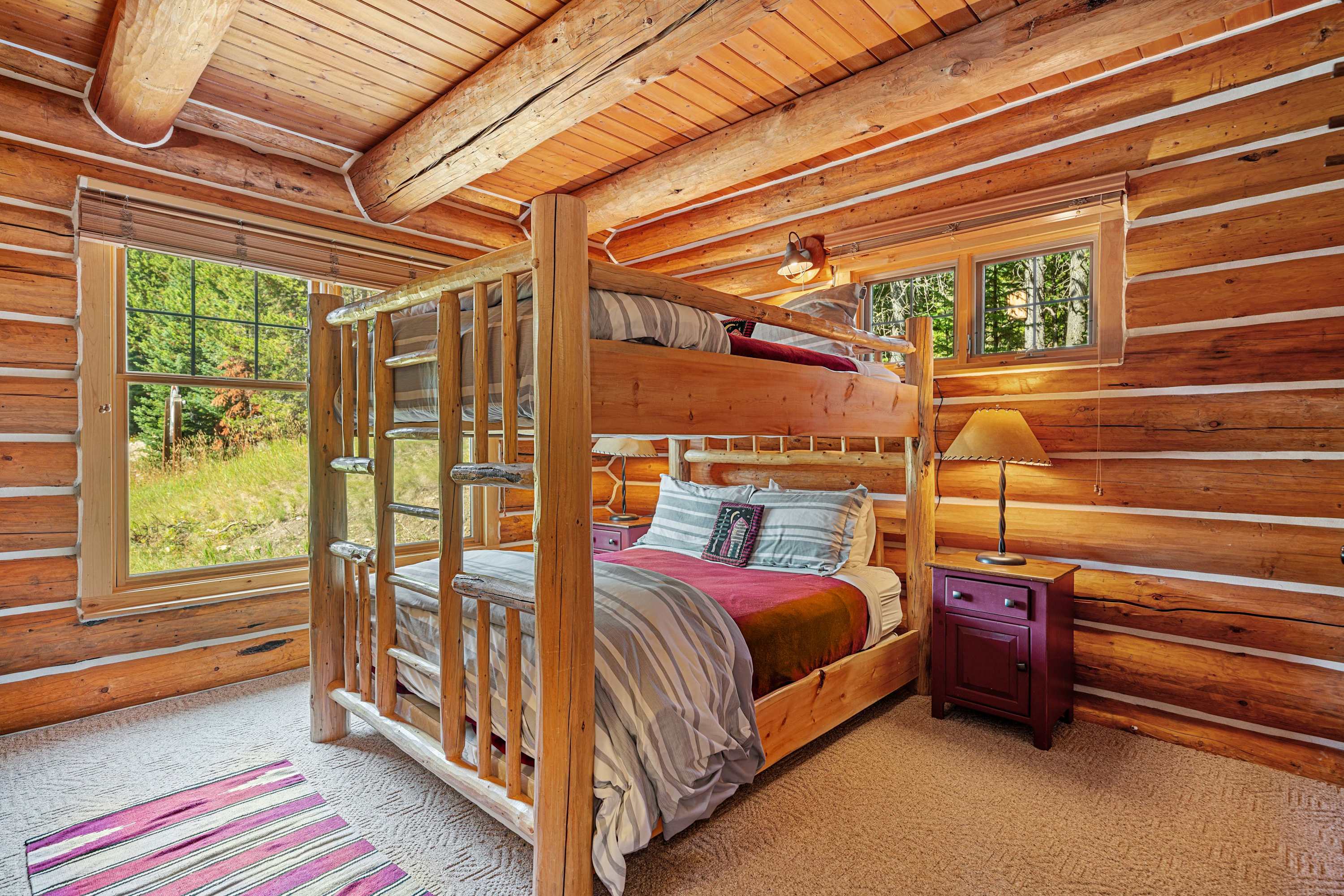 Powder Ridge Log Cabin boasts 1,600 sq feet of well-appointed living space over two levels for recreation, relaxation and good times with friends and family. The luxurious interiors elegantly complement the rustic, cabin-in-the-woods exterior. Soaring vaulted ceilings, log paneling and rustic accents give this Big Sky rental a true mountain cabin ambiance.