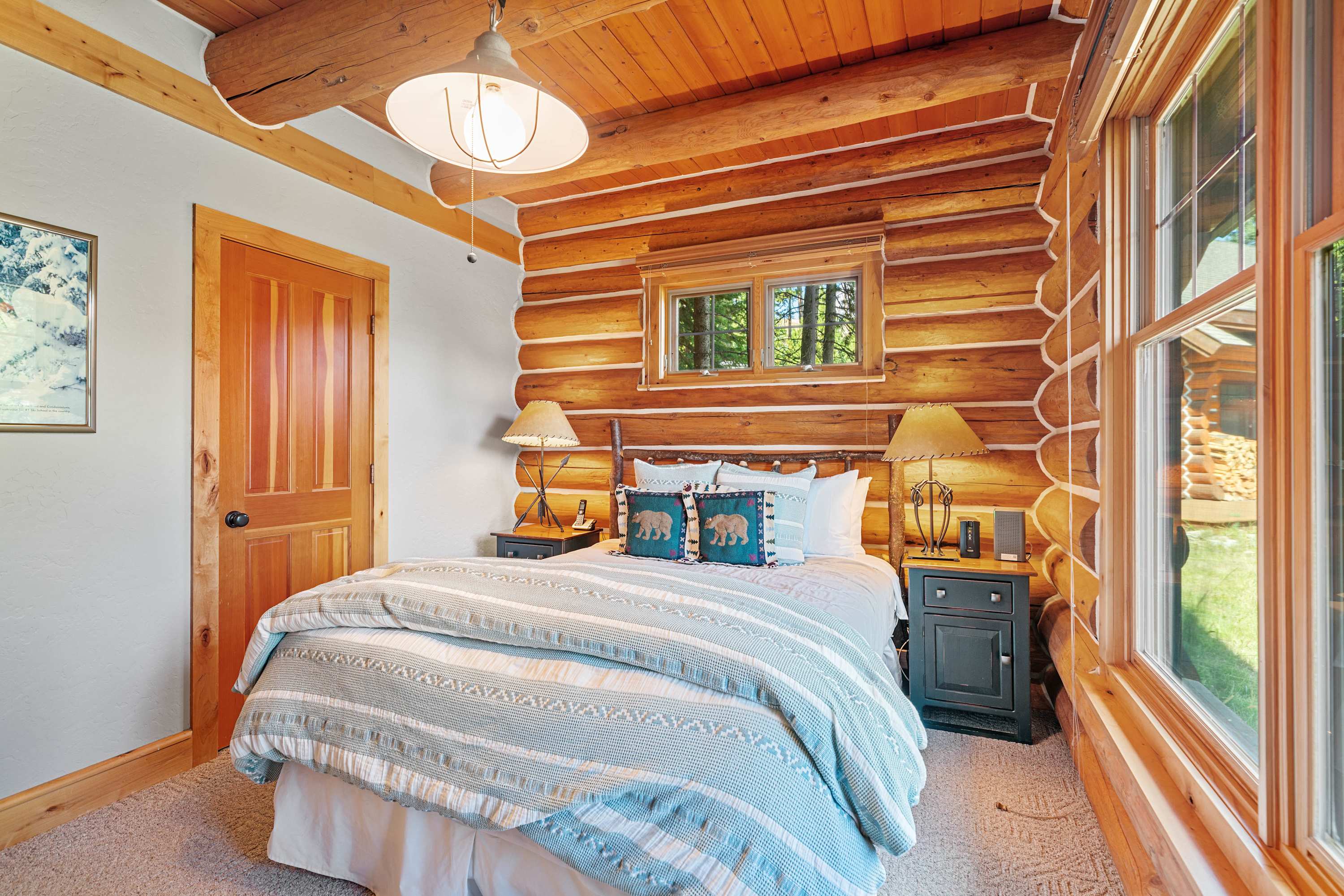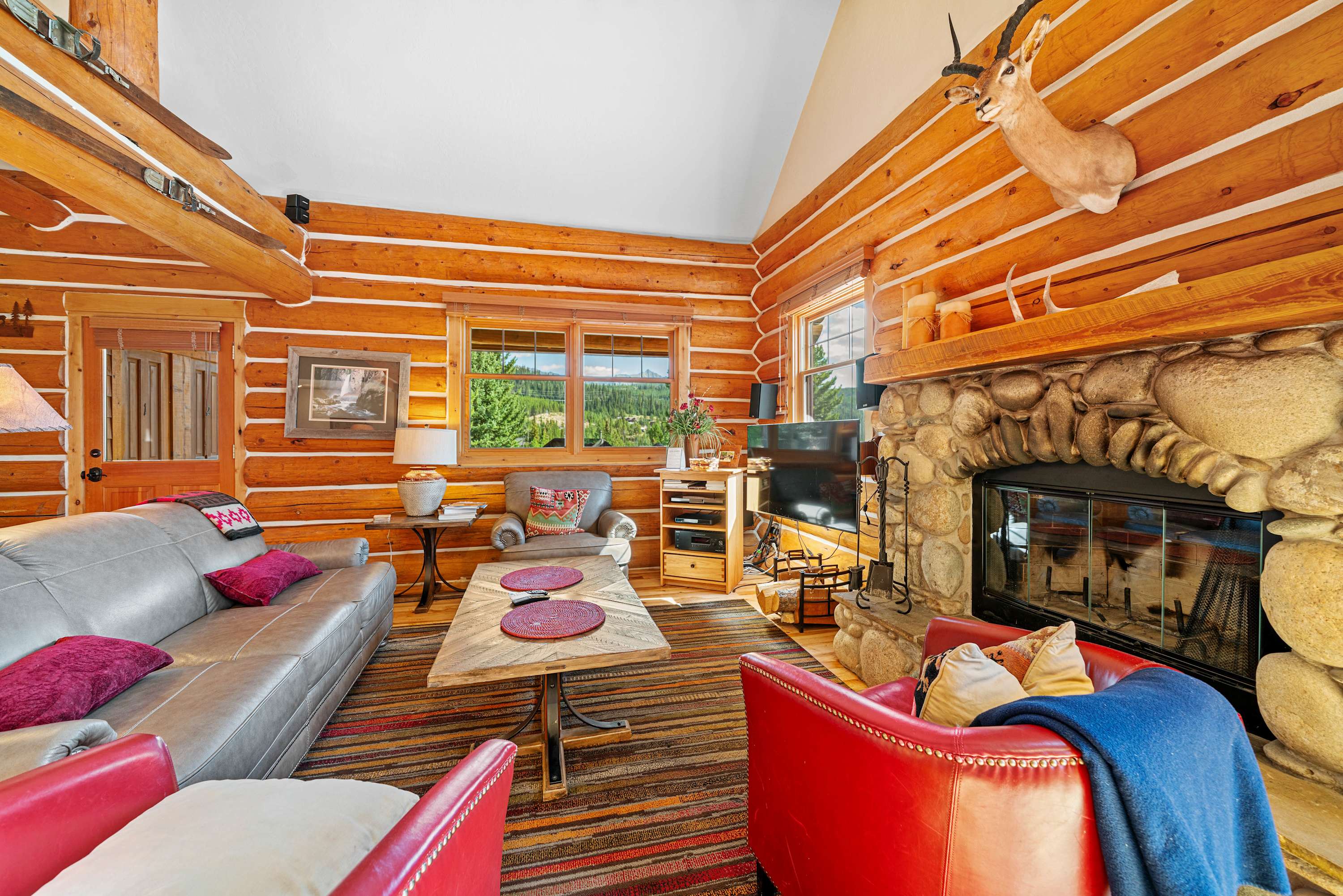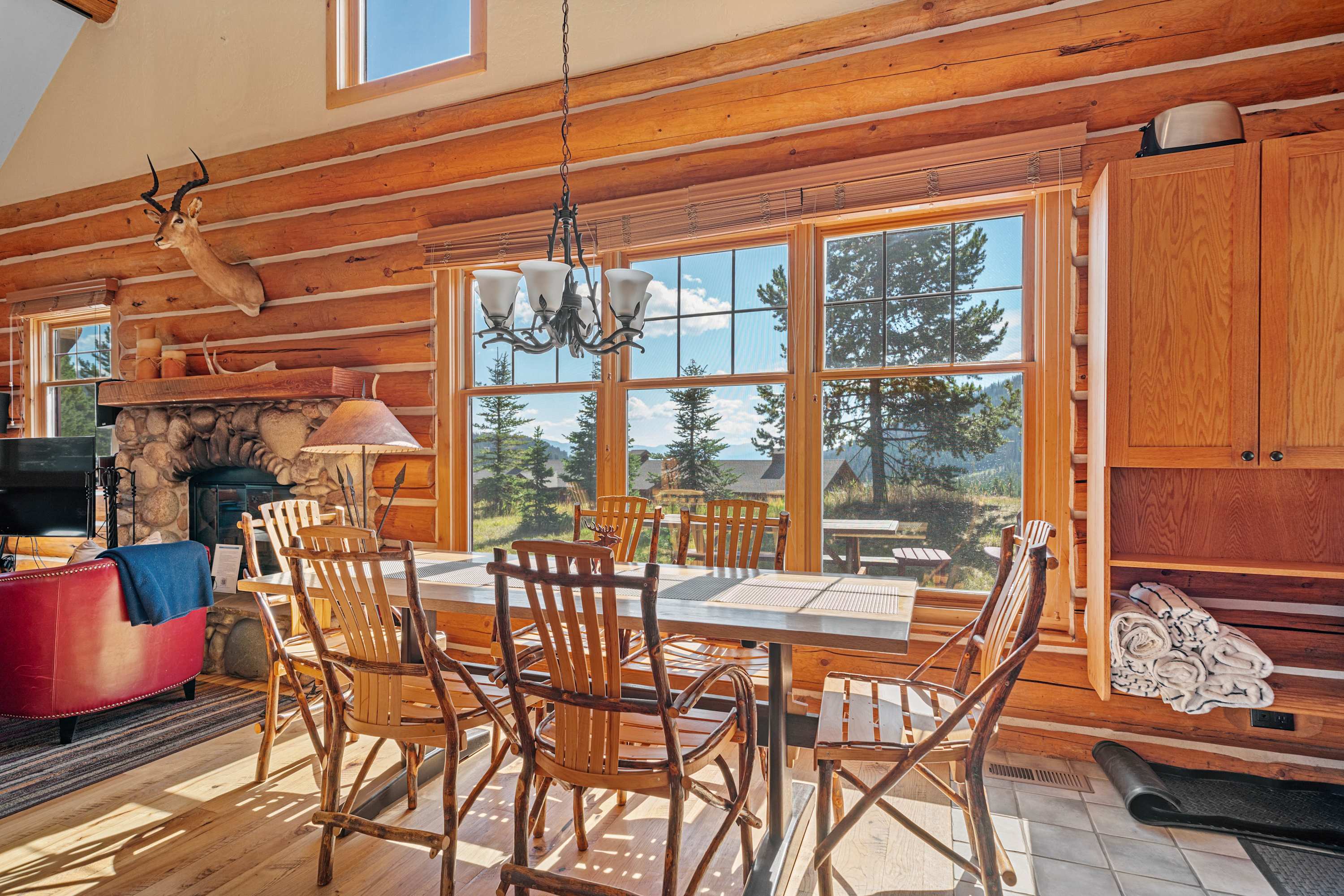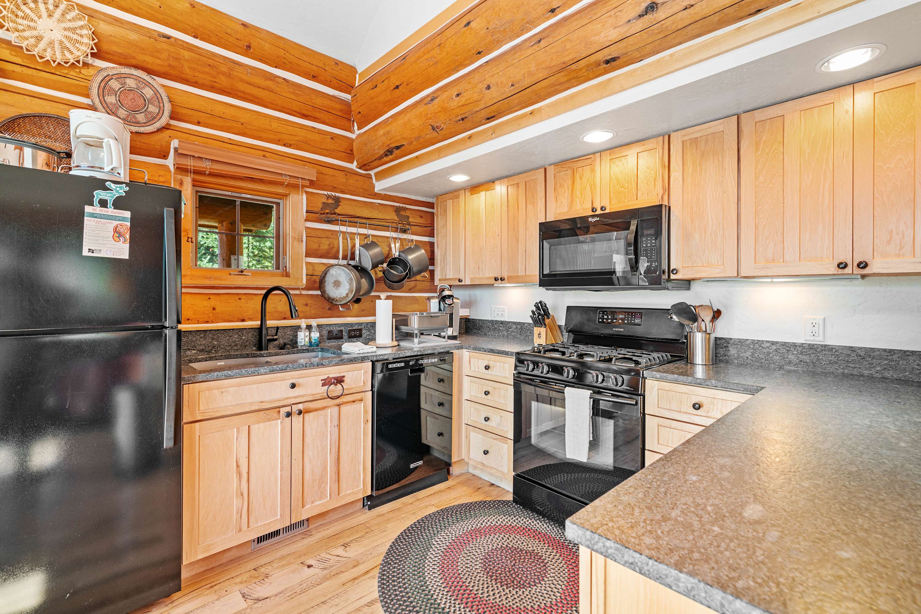 Powder Ridge Log Cabin boasts 1,600 sq feet of well-appointed living space over two levels for recreation, relaxation and good times with friends and family. The luxurious interiors elegantly complement the rustic, cabin-in-the-woods exterior. Soaring vaulted ceilings, log paneling and rustic accents give this Big Sky rental a true mountain cabin ambiance.