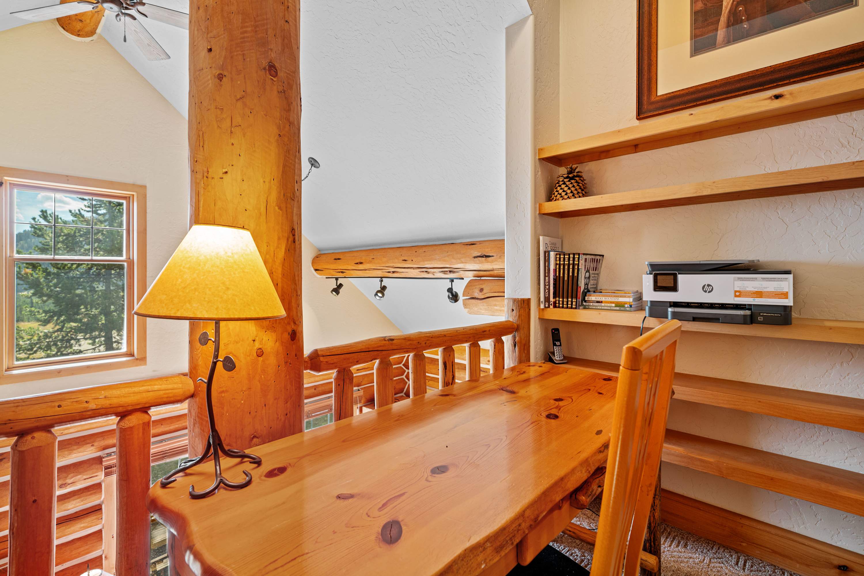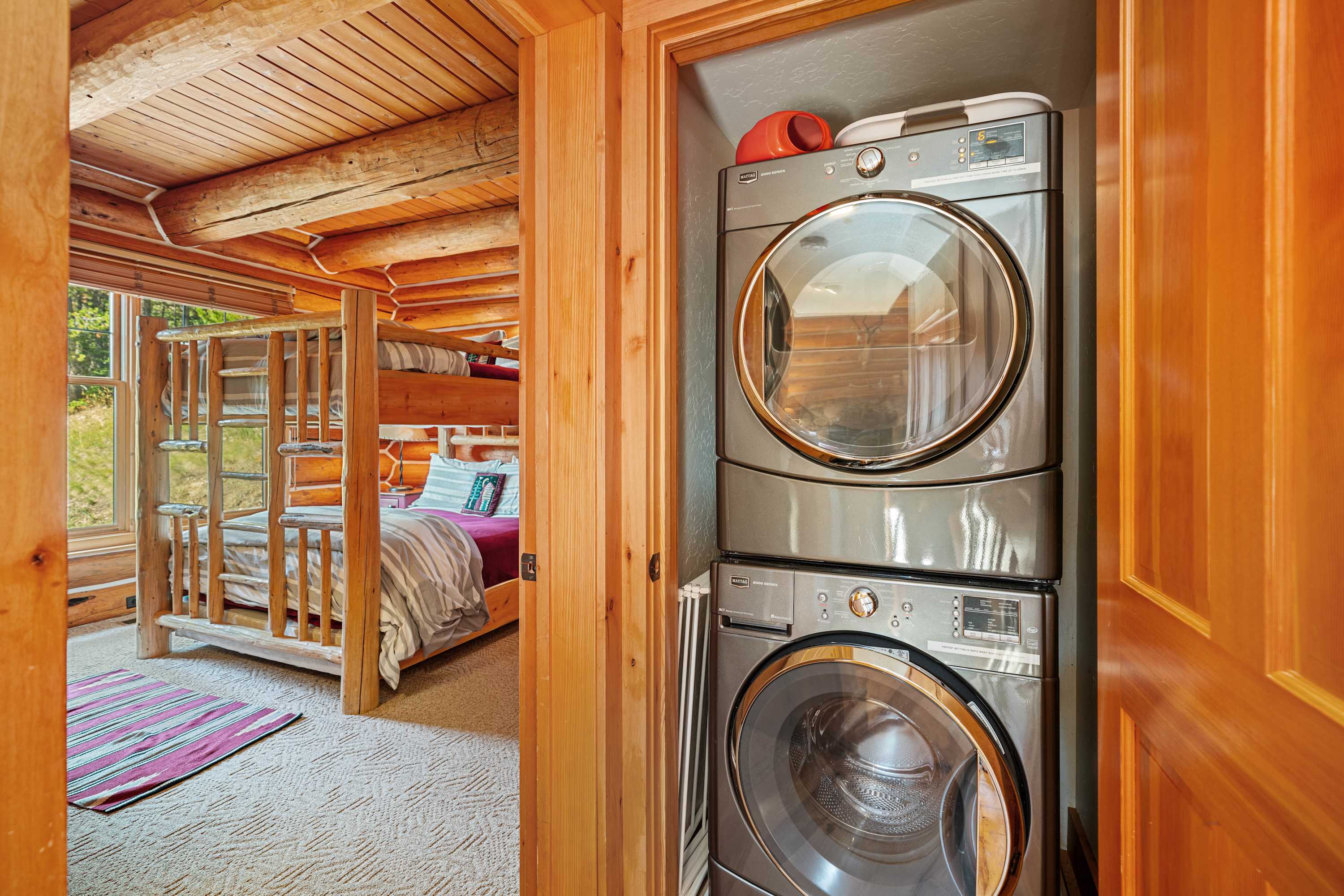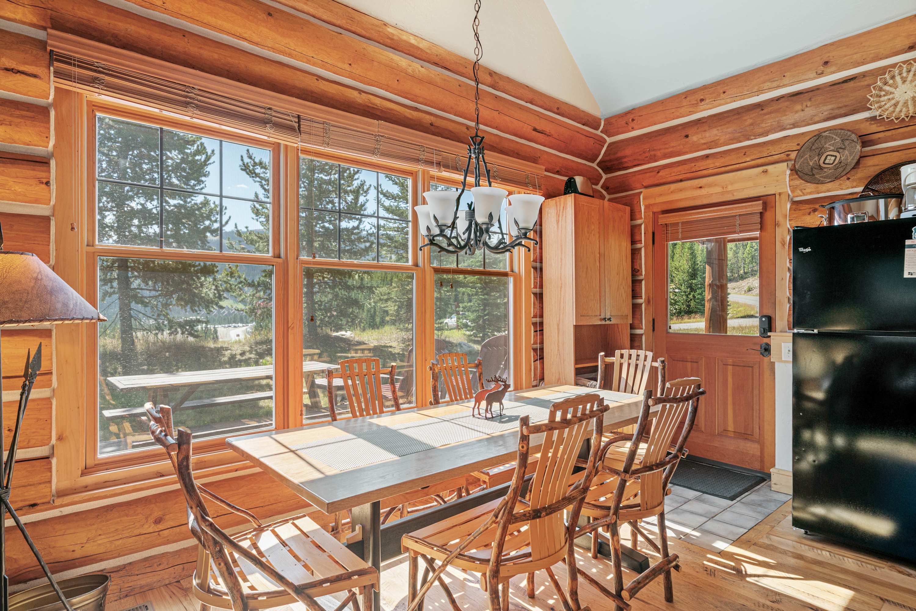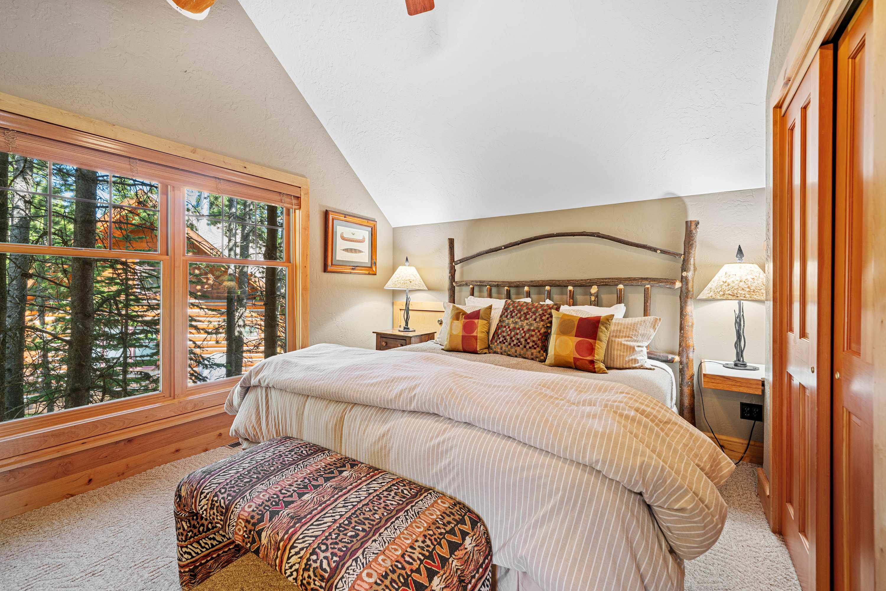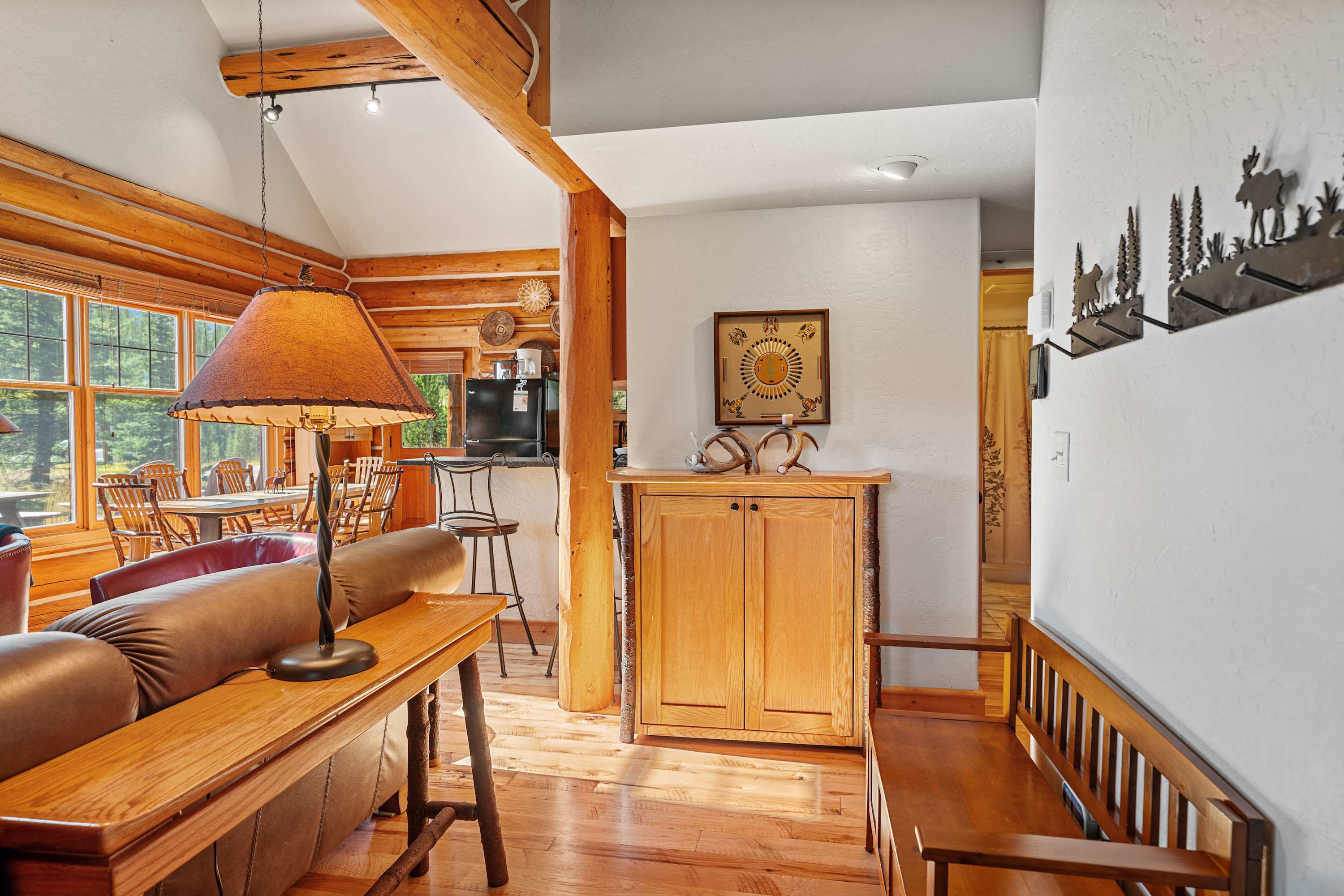 Powder Ridge Log Cabin boasts 1,600 sq feet of well-appointed living space over two levels for recreation, relaxation and good times with friends and family. The luxurious interiors elegantly complement the rustic, cabin-in-the-woods exterior. Soaring vaulted ceilings, log paneling and rustic accents give this Big Sky rental a true mountain cabin ambiance.