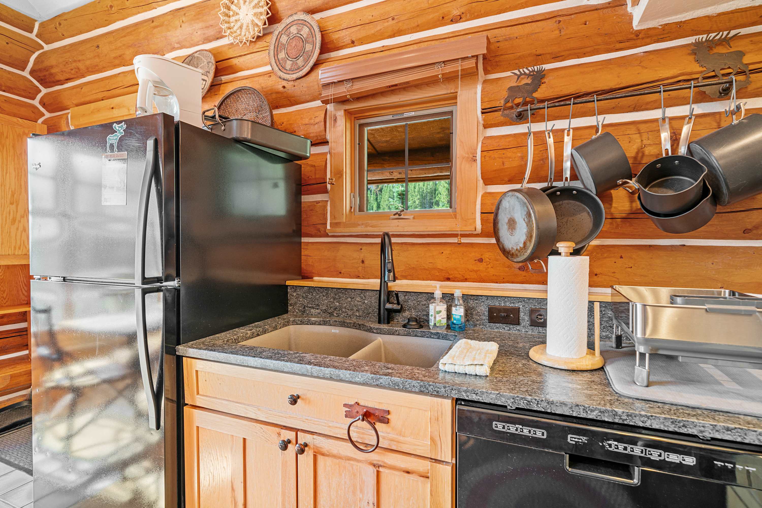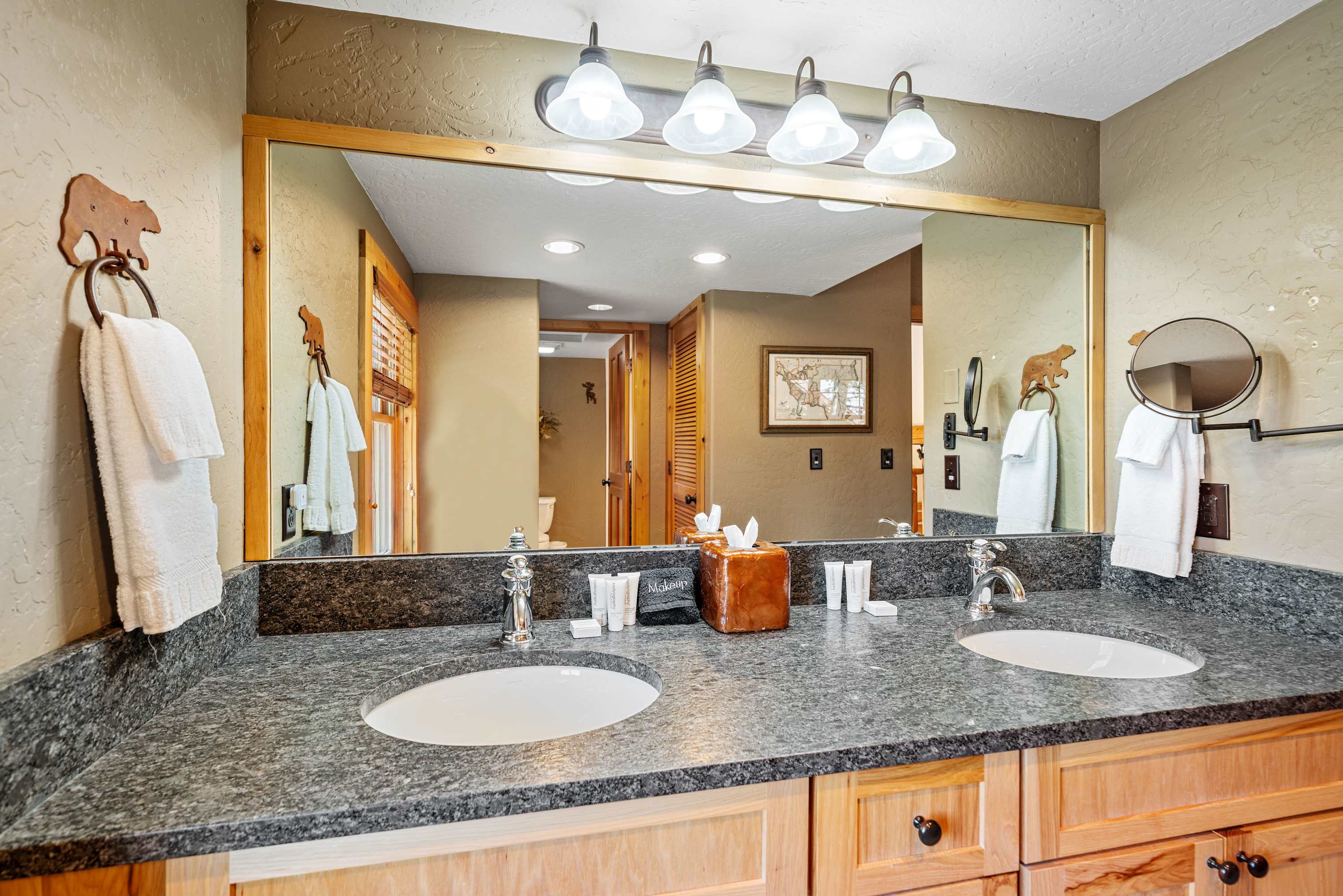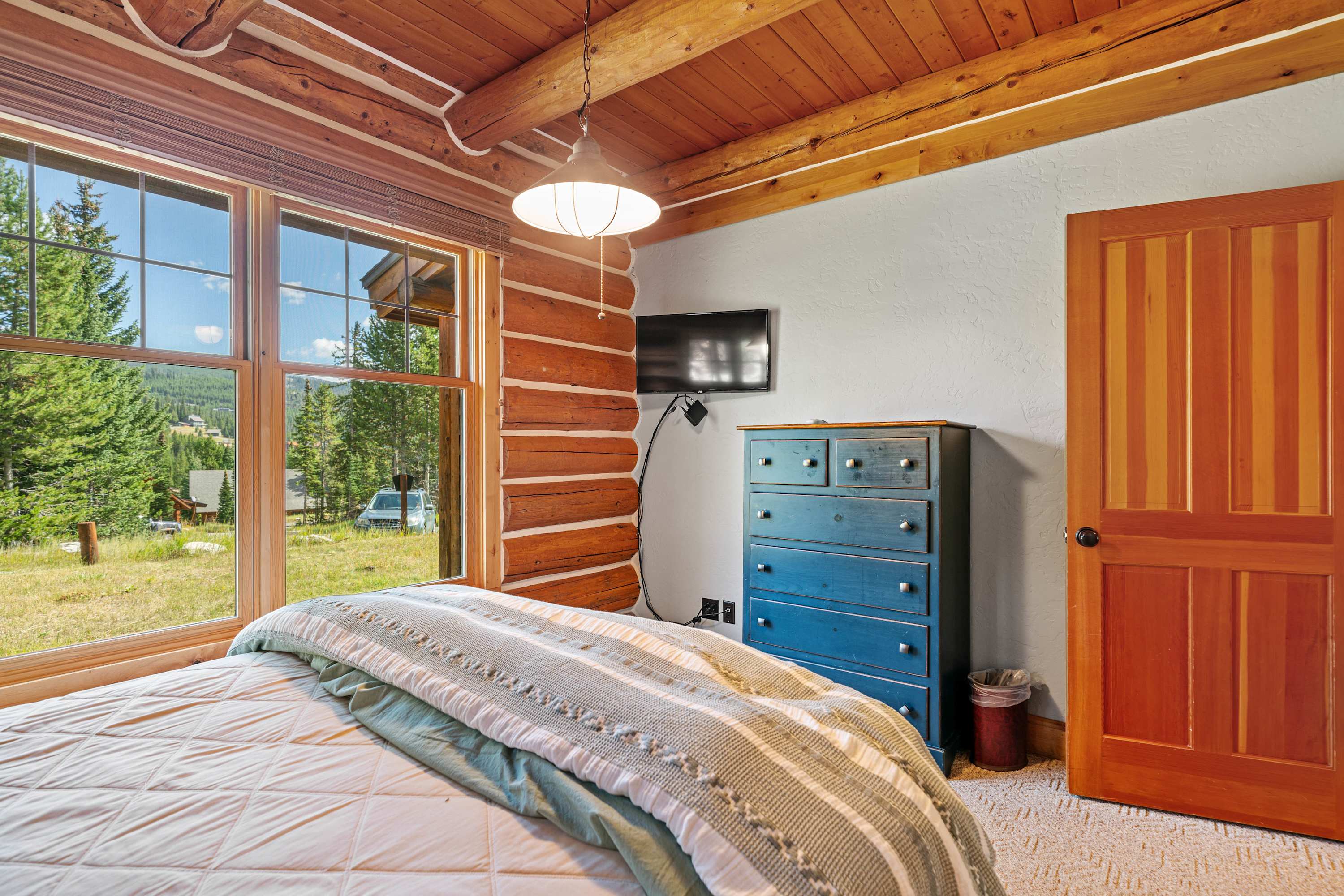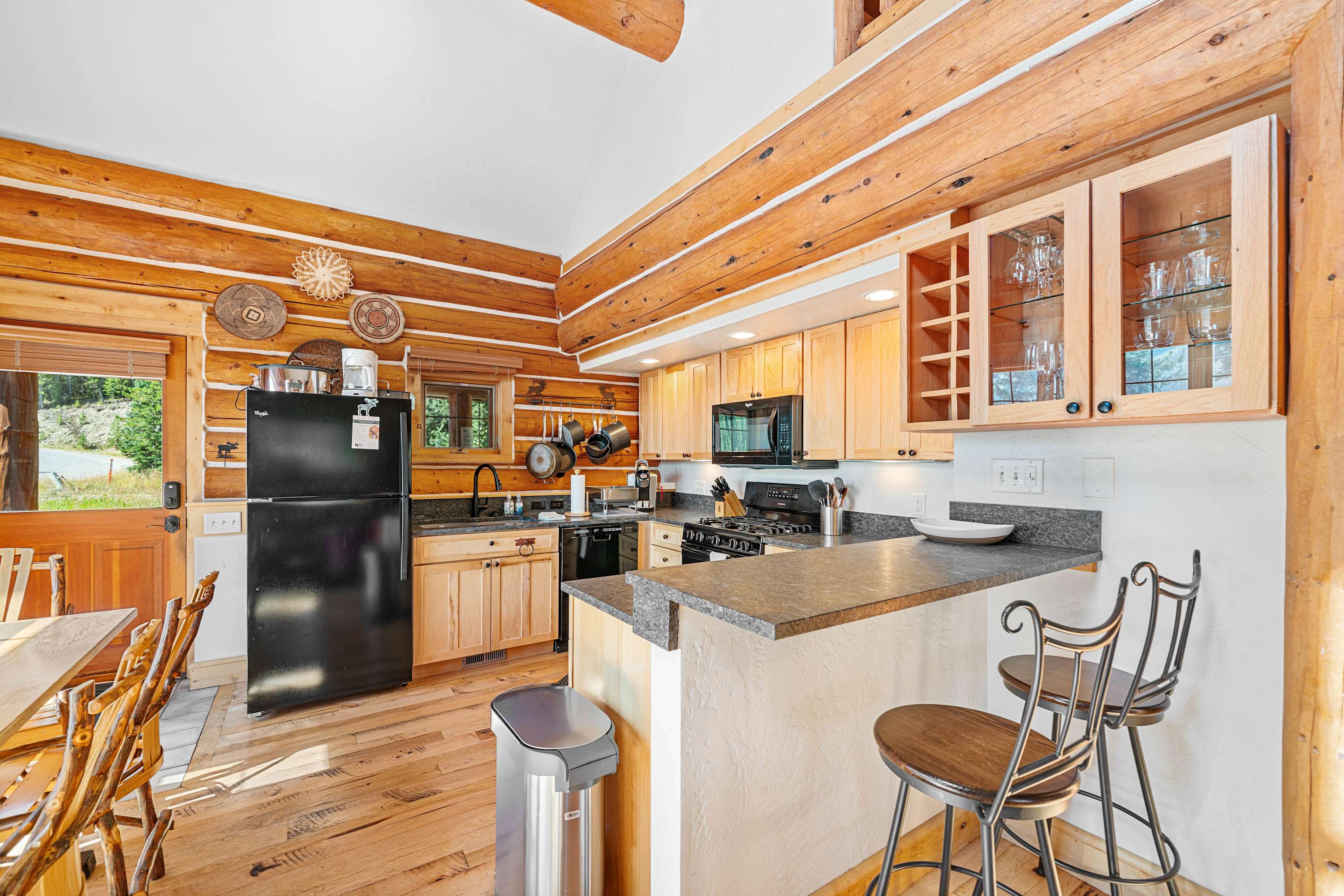Powder Ridge Log Cabin boasts 1,600 sq feet of well-appointed living space over two levels for recreation, relaxation and good times with friends and family. The luxurious interiors elegantly complement the rustic, cabin-in-the-woods exterior. Soaring vaulted ceilings, log paneling and rustic accents give this Big Sky rental a true mountain cabin ambiance.