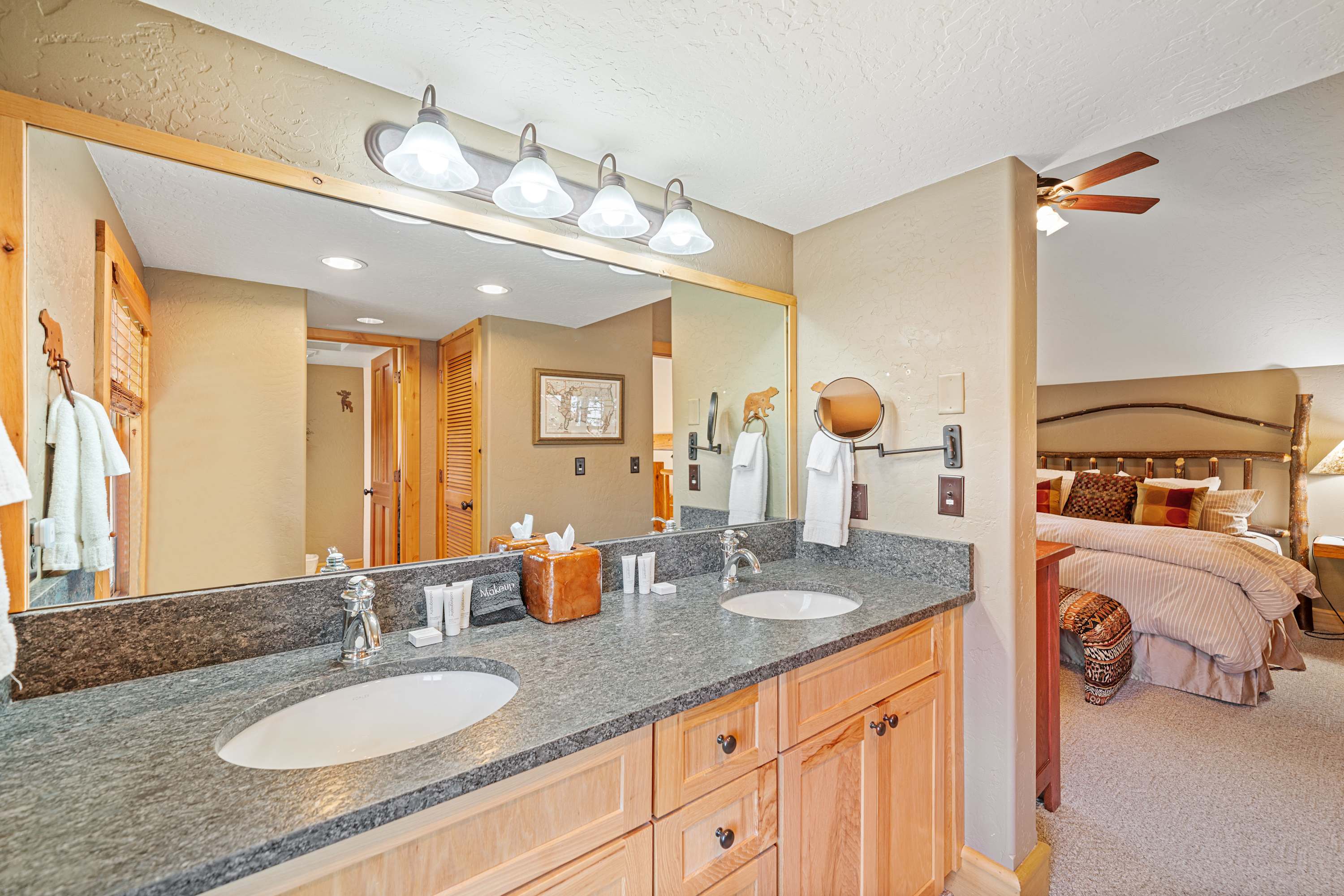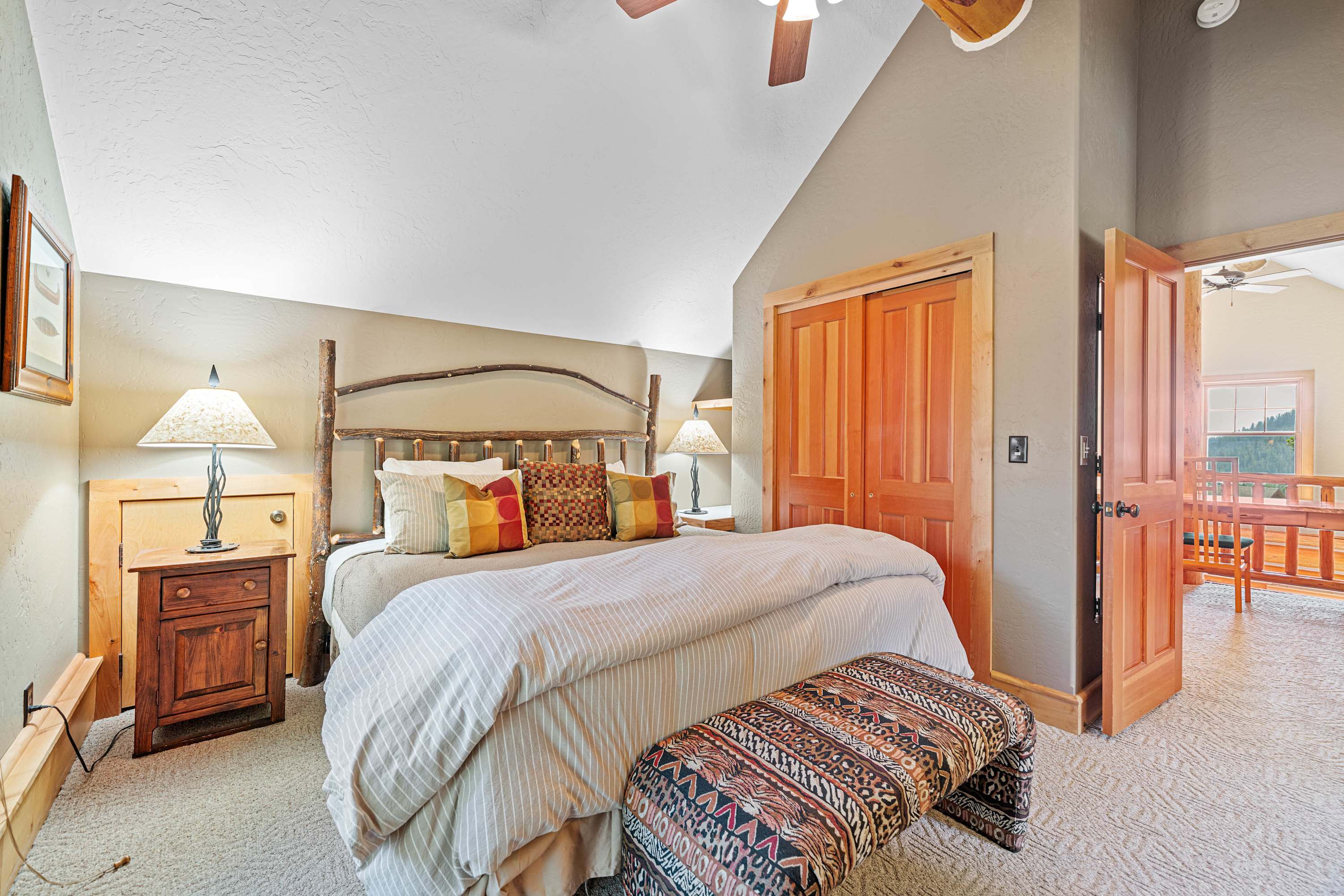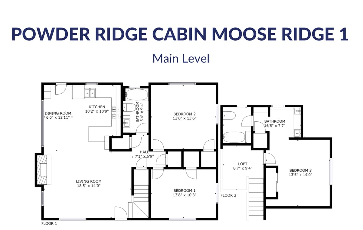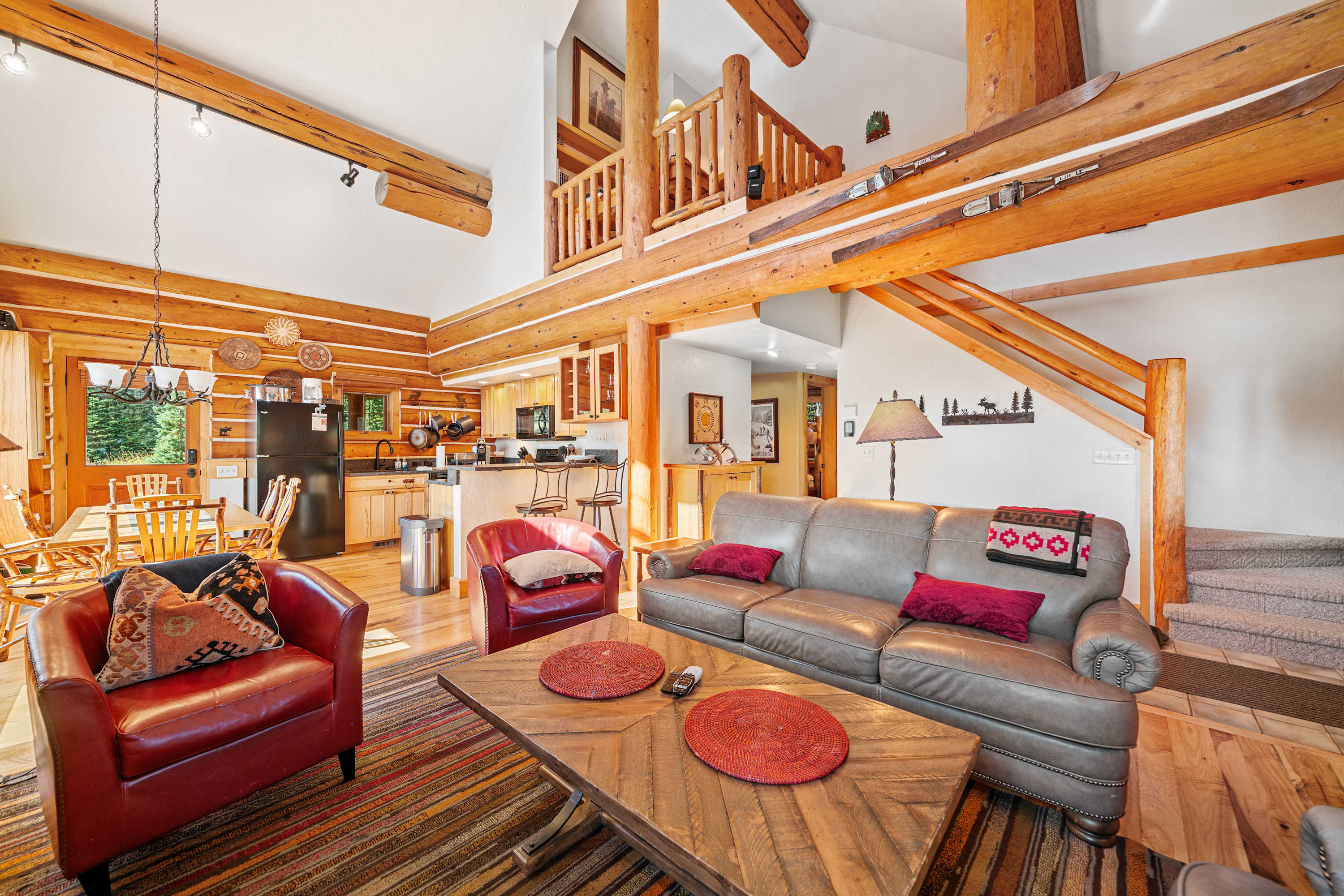 The main level of the home features an open plan living area with comfy leather couches and accent barrel chairs, an inviting wood fireplace and a flat screen TV for entertainment. The kitchen is fully-equipped with modern appliances and amenities, an adjoining dining table for sharing meals and seating at the bar counter for extra guests. There are two bedrooms on the main level of the home, an inviting queen bedroom and a bunk room with custom queen bunks, sharing a full bathroom with a shower and bathtub. The upper level loft area is home to a luxurious king master suite with a private bathroom. There is a laptop friendly workspace on the landing, should you need to work from home.