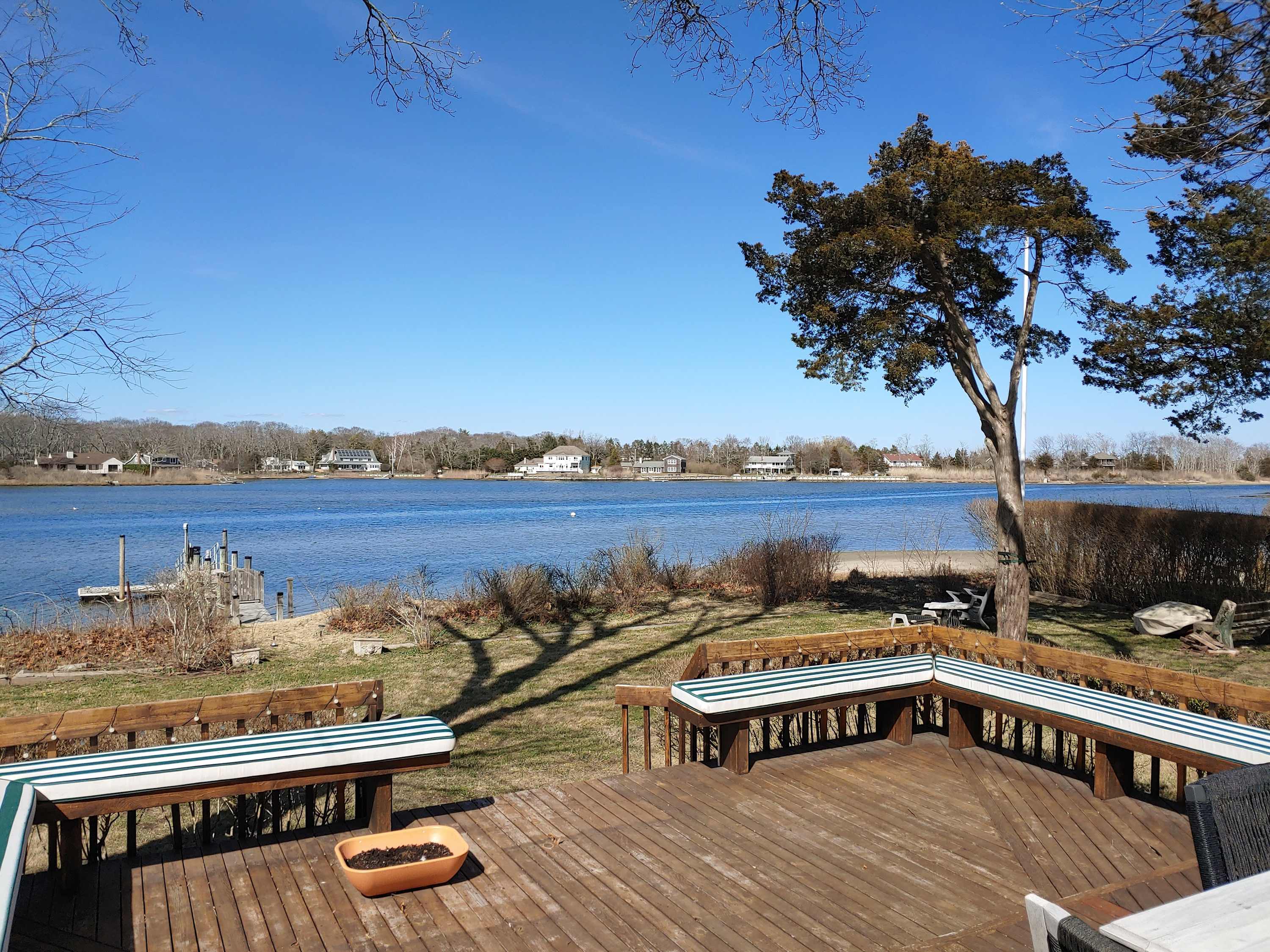 This waterfront home sits directly on Goose Creek in Southold, with a private dock, kayaks, and wide water views from the back deck. The property is on a quiet residential street and offers a comfortable layout for families or small groups booking two weeks or longer on the North Fork.